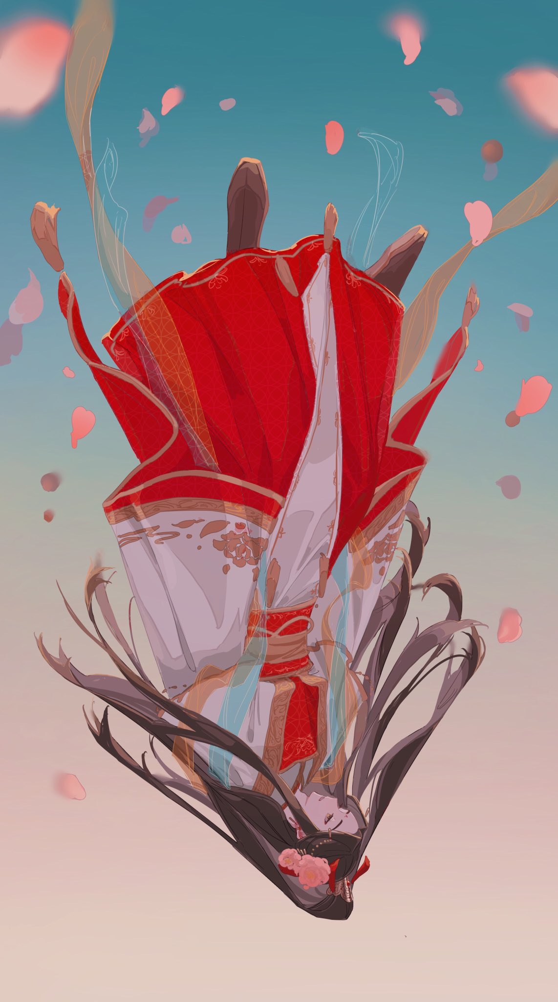 1boy aqua_shawl black_hair black_shoes chinese_clothes earrings falling falling_petals flower full_body gradient_background hair_flower hair_ornament half_updo hanfu high_ponytail highres jewelry long_hair long_sleeves male_focus official_alternate_costume official_alternate_hairstyle petals pink_flower ponytail red_hanfu sash shawl shoes sky solo tianguan_cifu upside-down very_long_hair whale_52hz_o wide_sleeves xie_lian xie_lian_(flower_crowned_martial_god)