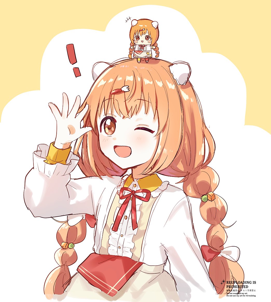 ! 1girl ;d apron blush bow braid brown_apron buttons center_frills character_doll collared_shirt commentary crossed_bangs cube_hair_ornament doll egg_hair_ornament food-themed_hair_ornament fork_hair_ornament frilled_shirt_collar frilled_sleeves frills hair_between_eyes hair_bobbles hair_bow hair_ornament hand_up kirara_tamako kirara_tamako_(1st_costume) long_hair long_sleeves looking_at_viewer nijisanji object_on_head one_eye_closed open_mouth orange_eyes orange_hair red_bow shirt sidelocks simple_background smile solo untranslatable_commentary twin_braids two-tone_background virtual_youtuber watermark white_background white_bow white_shirt yellow_background yotsuba_kuro