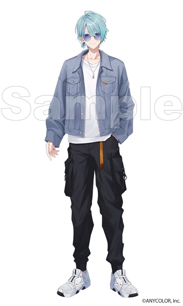 1boy ahoge black_pants blue_eyes blue_hair blue_jacket breast_pocket closed_mouth collarbone collared_jacket commentary_request company_name copyright_notice hair_between_eyes hand_in_pocket jacket jewelry long_sleeves looking_at_viewer male_focus mole mole_on_neck nagisa_trout nagisa_trout_(2nd_costume) necklace nijisanji official_alternate_costume official_art open_clothes open_jacket pants parted_bangs pocket purple-tinted_eyewear round_eyewear sample_watermark shirt shoes short_hair simple_background sleeves_past_wrists smile solo sunglasses talunilu_uu3 tinted_eyewear virtual_youtuber watermark white_background white_shirt white_shoes