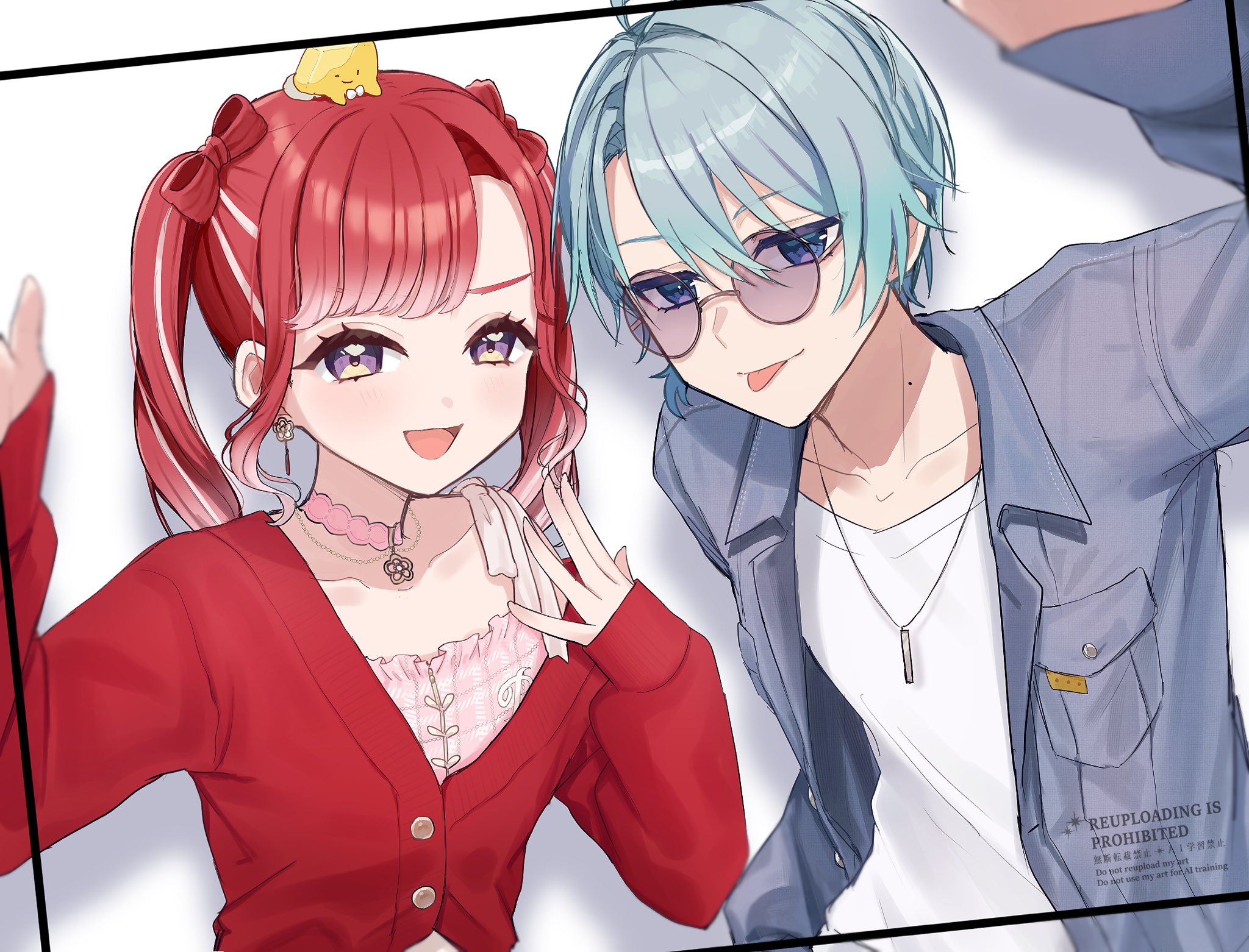 1boy 1girl :d :p ahoge arm_up blue_eyes blue_hair blue_jacket blush bow-shaped_hair breast_pocket buttons cardigan choker closed_mouth collarbone collared_jacket commentary earrings flower flower_earrings flower_necklace frilled_shirt frills gradient_hair hand_up highres jacket jewelry long_hair long_sleeves looking_at_viewer mole mole_on_neck multicolored_hair nagisa_trout nagisa_trout_(2nd_costume) necklace nijisanji open_clothes open_jacket open_mouth parted_bangs pink_choker pink_shirt pocket purple_eyes red_cardigan red_hair round_eyewear saotome_berry saotome_berry_(2nd_costume) shirt short_hair sidelocks sleeves_past_wrists smile streaked_hair sunglasses untranslatable_commentary tongue tongue_out twintails upper_body virtual_youtuber watermark white_hair white_shirt yotsuba_kuro