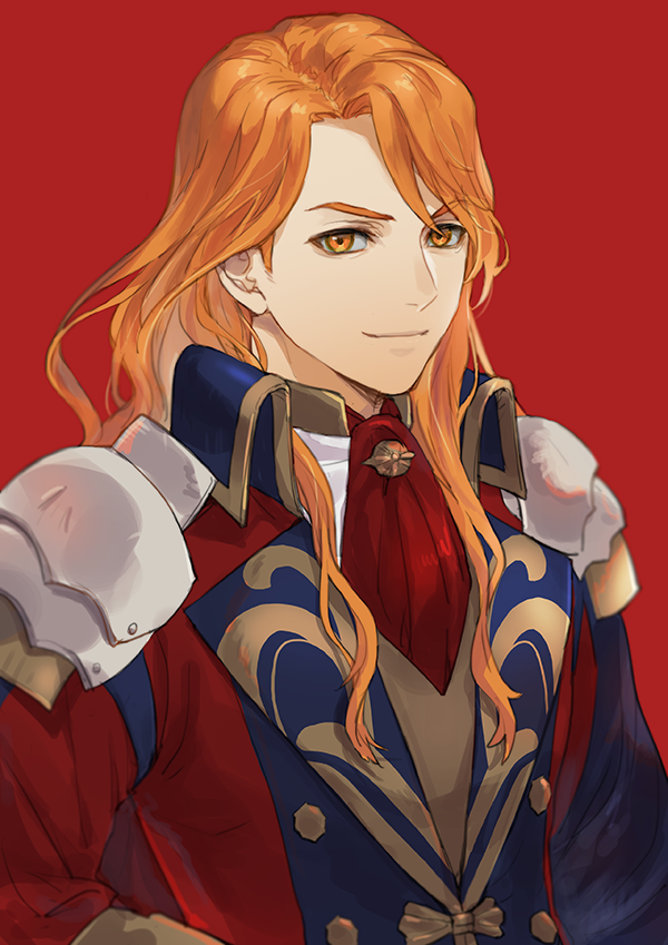 1boy armor ascot buttons closed_mouth commentary_request ferdinand_von_aegir ferdinand_von_aegir_(timeskip) fire_emblem fire_emblem:_three_houses high_collar isa_(peien516) lapels long_hair long_sleeves looking_to_the_side male_focus nintendo orange_eyes orange_hair ornate_clothes parted_bangs parted_hair pauldrons red_ascot red_background shoulder_armor simple_background smile solo upper_body wing_collar