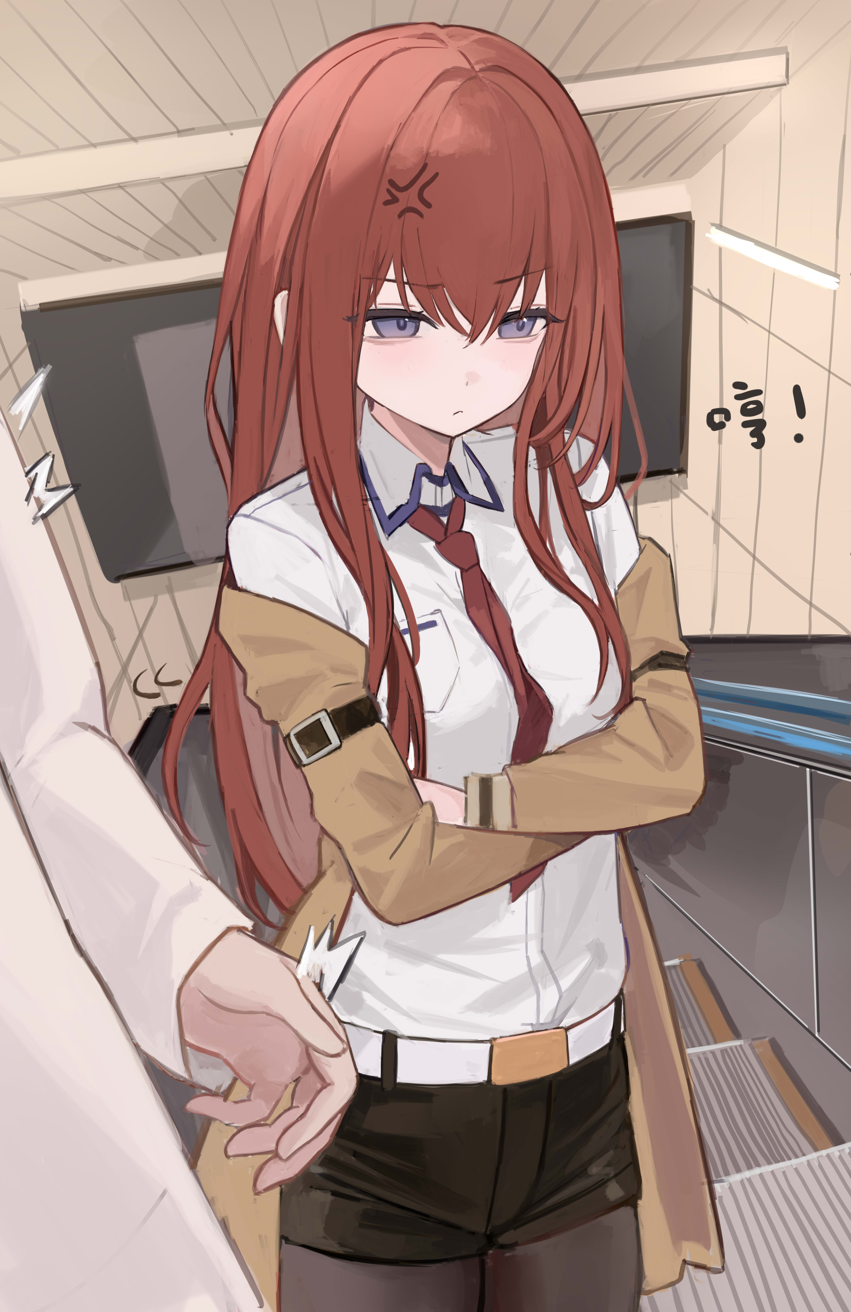 1boy 1girl absurdres anger_vein belt black_pantyhose black_shorts breasts brown_vest coat commentary_request crossed_arms highres long_hair makise_kurisu medium_breasts nagata_gata necktie okabe_rintarou pantyhose purple_eyes red_hair red_necktie science_adventure short_shorts shorts stairs steins;gate vest white_belt white_coat