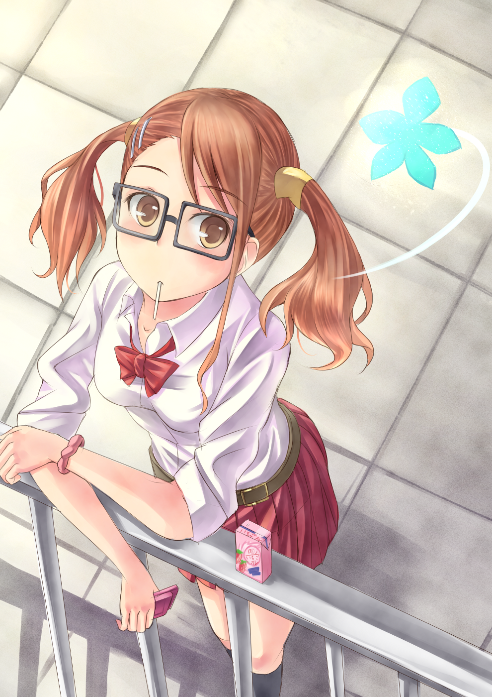 10s 1girl anjou_naruko ano_hi_mita_hana_no_namae_wo_bokutachi_wa_mada_shiranai. bad_id bad_pixiv_id belt female_focus food_in_mouth glasses hair_ornament highres jewelry kino_(kino_buro) leaning long_hair matching_hair/eyes mouth_hold orange_eyes orange_hair railing school_uniform skirt sleeves_rolled_up solo twintails