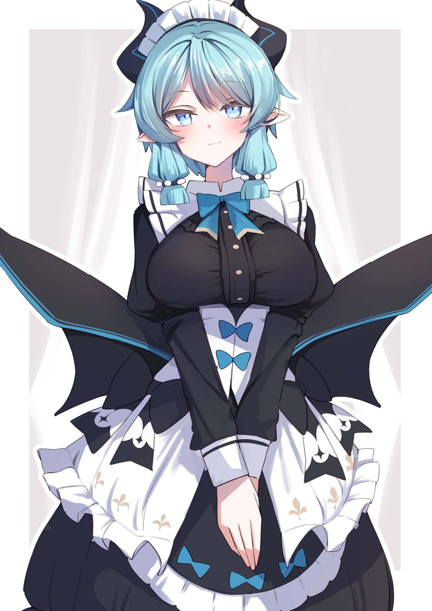 1girl alternate_costume apron aqua_hair black_dress black_horns black_wings blue_bow blue_bowtie blue_eyes blue_hair blush border bow bowtie breasts closed_mouth collared_dress cowboy_shot demon_girl demon_horns demon_wings dragon_girl dragon_horns dress duel_monster enmaided frilled_apron frilled_dress frills grey_background highres horns juliet_sleeves large_breasts light_smile long_sleeves looking_at_viewer low_wings maid maid_apron maid_headdress medium_breasts medium_hair multiple_wings outline own_hands_together parted_bangs pointy_ears puffy_long_sleeves puffy_sleeves satarina-san short_hair sidelocks simple_background six_box smile solo standing two-tone_background v_arms vrchat white_apron white_background white_border white_outline wings
