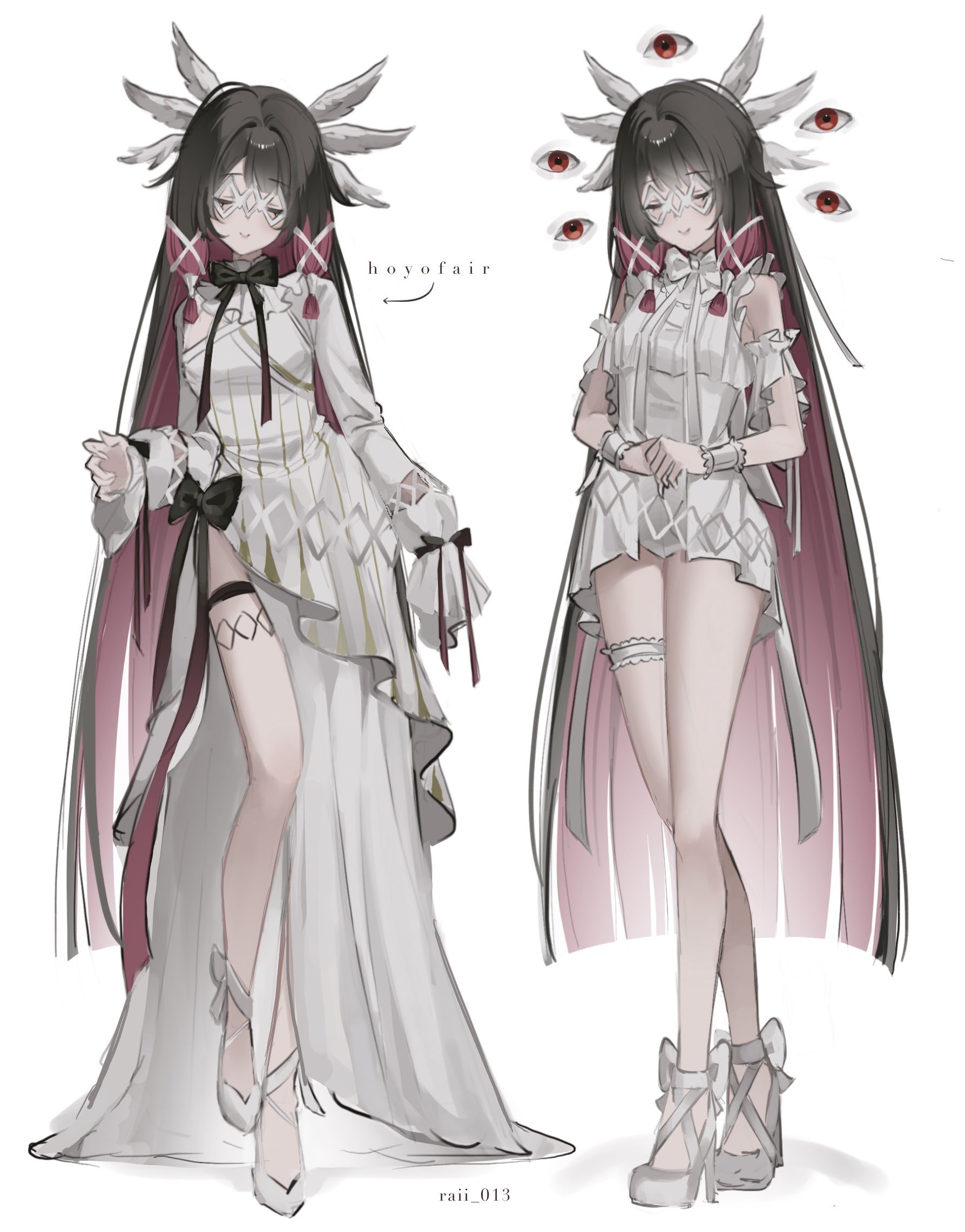 1girl asymmetrical_sleeves black_bow black_bowtie black_hair blunt_bangs blunt_ends blunt_tresses bow bowtie closed_eyes closed_mouth collar colored_inner_hair columbina_(genshin_impact) contrapposto detached_sleeves dress extra_eyes eye_mask footwear_bow frilled_collar frilled_sleeves frilled_thigh_strap frills genshin_impact hair_intakes hair_ribbon hand_up head_wings highleg highleg_leotard highres hime_cut hoyofair leotard long_hair long_sleeves male_underwear mask multicolored_hair multiple_wings own_hands_together parted_bangs pink_hair raii_0103 ribbon ribbon-trimmed_sleeves ribbon_trim shoes side_slit sleeves_past_fingers sleeves_past_wrists smile standing thigh_strap tress_ribbon underwear variations very_long_hair white_background white_dress white_leotard white_male_underwear white_shoes white_sleeves white_wings white_wrist_cuffs wings wrist_cuffs x-shaped_eyewear