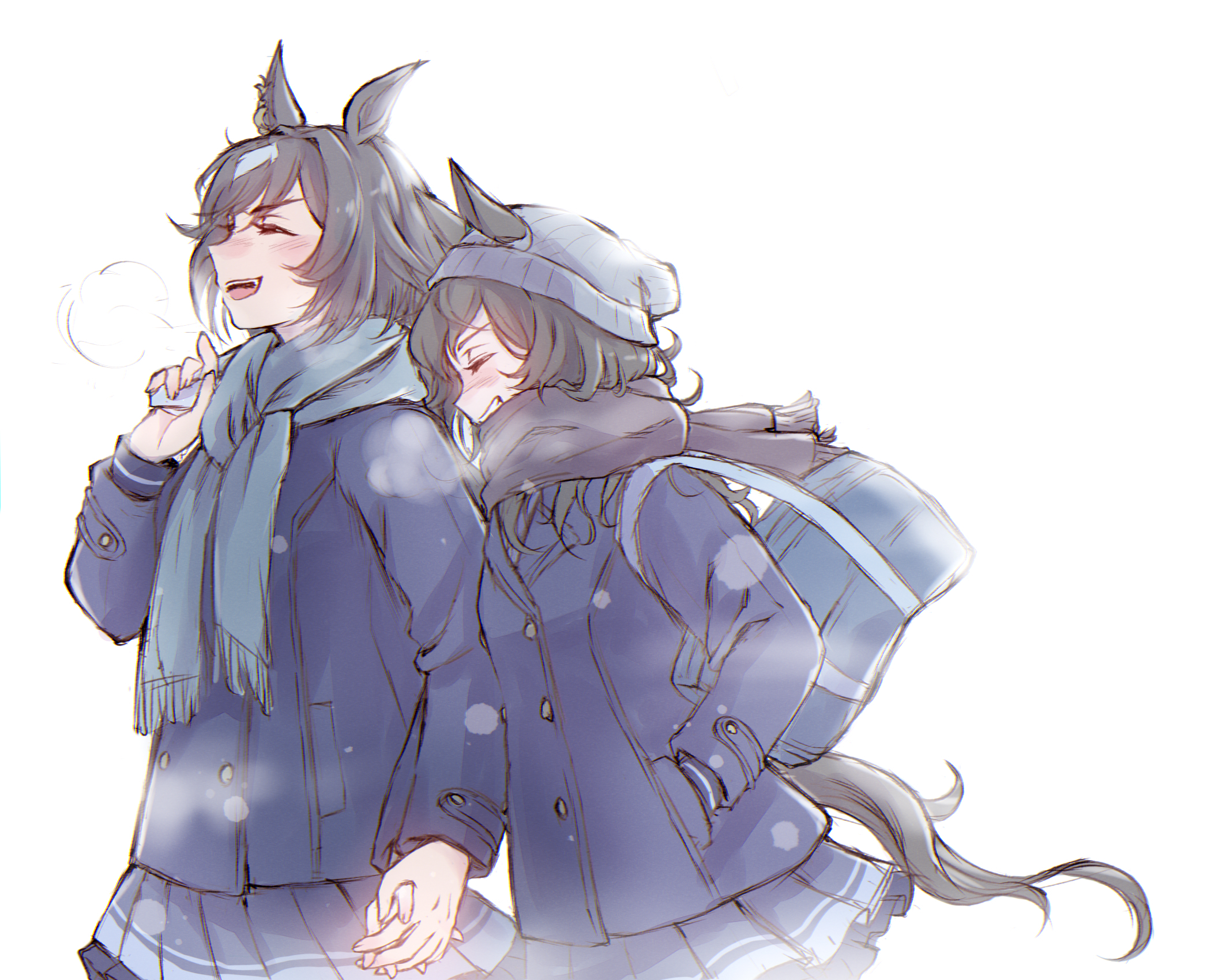 2girls animal_ears bag beanie blue_coat blue_skirt blush brown_hair brown_tail closed_eyes coat commentary_request couple cowboy_shot ear_ornament ears_through_headwear grey_hat grin hand_in_pocket hat height_difference highres holding_hands horse_ears horse_girl horse_tail long_hair long_sleeves multicolored_hair multiple_girls nakayama_festa_(umamusume) namuko pleated_skirt scarf school_bag shoulder_bag sirius_symboli_(umamusume) skirt smile streaked_hair tail tracen_winter_coat umamusume v-shaped_eyebrows white_hair winter winter_clothes yuri