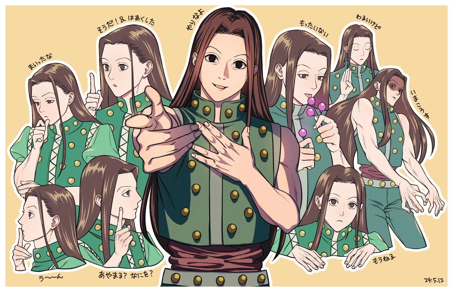 1boy black_eyes black_hair border closed_mouth green_pants green_shirt highres hunter_x_hunter illumi_zoldyck long_hair male_focus multiple_views open_mouth outline pants pointing pointing_at_viewer shakikashi shirt translation_request white_border white_outline yellow_background