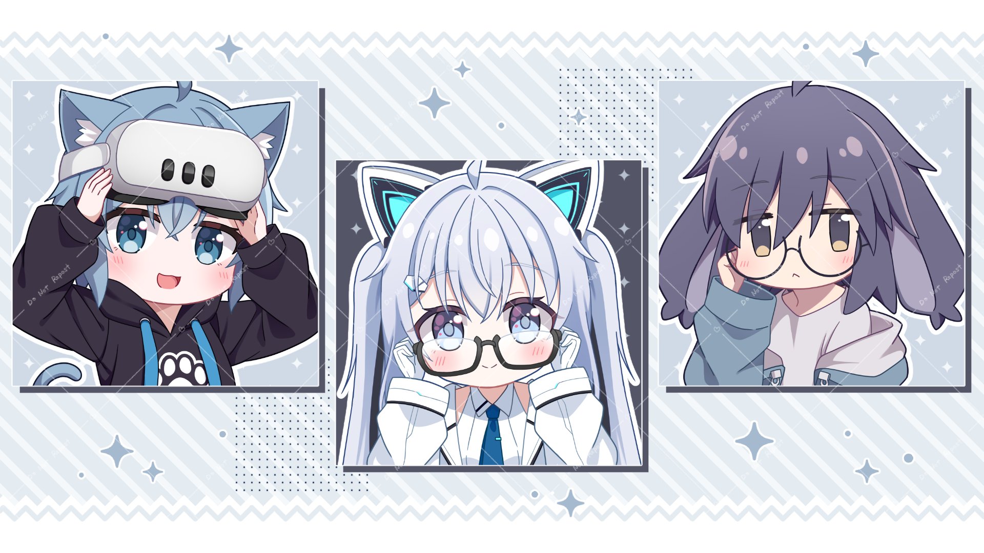 3girls :3 :d adjusting_eyewear ahoge animal_ear_fluff animal_ear_headphones animal_ears arms_up black-framed_eyewear black_hair black_hoodie black_jacket blue_eyes blue_hair blue_hoodie blue_jacket blue_necktie blush brown_eyes cat_ears cat_girl cat_hair_ornament cat_tail chibi closed_mouth collared_shirt drawstring fake_animal_ears glasses gloves grey_hair grey_shirt hair_between_eyes hair_ornament hands_on_own_head hands_up head-mounted_display headgear headphones highres hood hood_down hooded_jacket hoodie jacket long_hair long_sleeves looking_at_viewer multiple_girls necktie off_shoulder open_clothes open_jacket open_mouth puffy_long_sleeves puffy_sleeves purple_hair rabbit_ears rabbit_hair_ornament rusk_(komado_booth) sapphy_(vrchat) semi-rimless_eyewear shirt sleeveless sleeveless_shirt sleeves_past_wrists smile striped_background tail twintails two_side_up under-rim_eyewear upper_body usasaki_(vrchat) very_long_hair vrchat white_gloves white_hoodie white_jacket white_shirt yukino_(weem4554)
