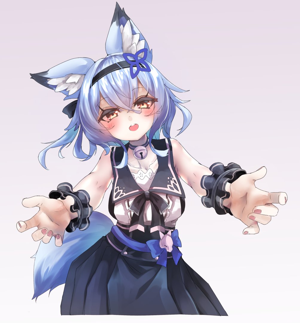 1girl animal_ear_fluff animal_ears bare_shoulders bell black_choker black_hairband black_sailor_collar black_skirt blue_bow blue_hair blue_ribbon blush bow breasts brown_eyes choker collar collarbone dress fox_ears fox_girl fox_tail hair_between_eyes hair_ornament hairband incoming_hug jingle_bell looking_at_viewer medium_breasts medium_hair neck_bell open_mouth outstretched_arms pink_nails reaching reaching_towards_viewer ribbon sailor_collar shirt short_hair simple_background six_box skirt sleeveless sleeveless_dress sleeveless_shirt solo tail teeth upper_teeth_only vrchat wrist_cuffs yellow_eyes yuuko-zoku_no_onee-chan