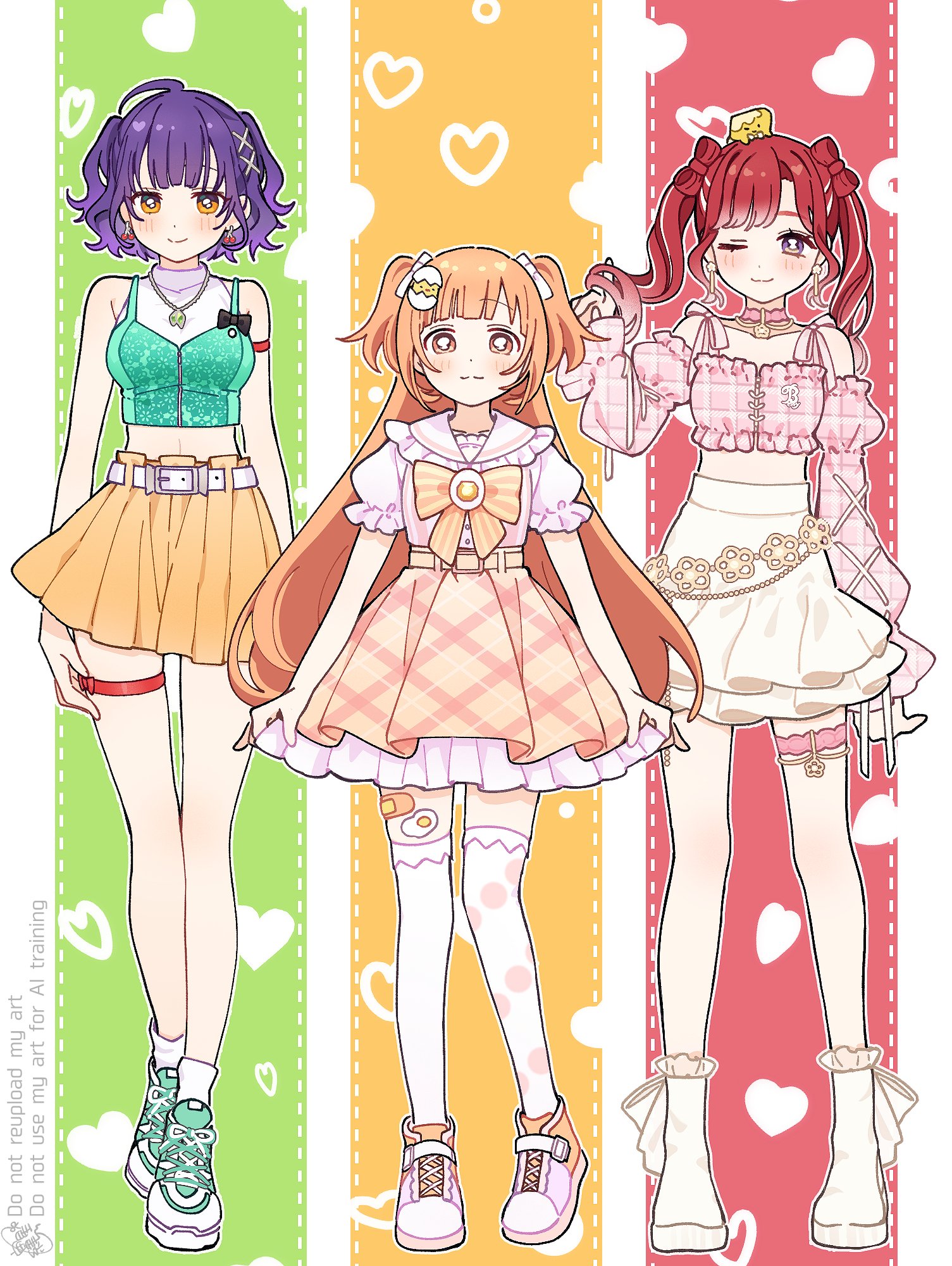 3girls ahoge aqua_shirt aqua_shoes bandaid bandaid_on_leg belt belt_buckle black_bow blush boots bow bow-shaped_hair bowtie brooch buckle cherry_earrings choker closed_mouth collarbone collared_shirt commentary crop_top cross-laced_clothes cross-laced_sleeves detached_sleeves earrings egg_hair_ornament eyelashes flower flower_earrings flower_necklace food-themed_earrings food-themed_hair_ornament food_themed_earrings frilled_boots frilled_shirt frilled_shirt_collar frilled_skirt frilled_sleeves frills gem green_background hair_ornament hair_ribbon hand_up heart high-waist_skirt highres jewelry kirara_tamako kirara_tamako_(2nd_costume) long_hair long_sleeves looking_at_viewer multicolored_hair multicolored_shoes multiple_girls nanase_suzuna nanase_suzuna_(2nd_costume) necklace nijisanji one_eye_closed orange_background orange_bow orange_bowtie orange_eyes orange_hair orange_shoes parted_bangs pink_choker pink_shirt pink_shoes pink_skirt pink_sleeves plaid_clothes plaid_shirt plaid_skirt plaid_sleeves pleated_skirt polka_dot polka_dot_thighhighs puffy_detached_sleeves puffy_long_sleeves puffy_short_sleeves puffy_sleeves purple_eyes purple_hair red_background red_hair ribbon saotome_berry saotome_berry_(2nd_costume) shirt shoes short_hair short_sleeves sidelocks signature skirt sleeveless sleeveless_shirt smile socks sorahoshi_ichino spaghetti_strap split_mouth standing streaked_hair striped_bow striped_bowtie striped_clothes untranslatable_commentary thigh_strap thighhighs turtleneck twintails two-tone_shoes two_side_up very_long_hair virtual_youtuber watermark wavy_hair white_background white_belt white_boots white_hair white_ribbon white_shirt white_shoes white_skirt white_socks white_thighhighs x_hair_ornament yellow_gem yellow_skirt
