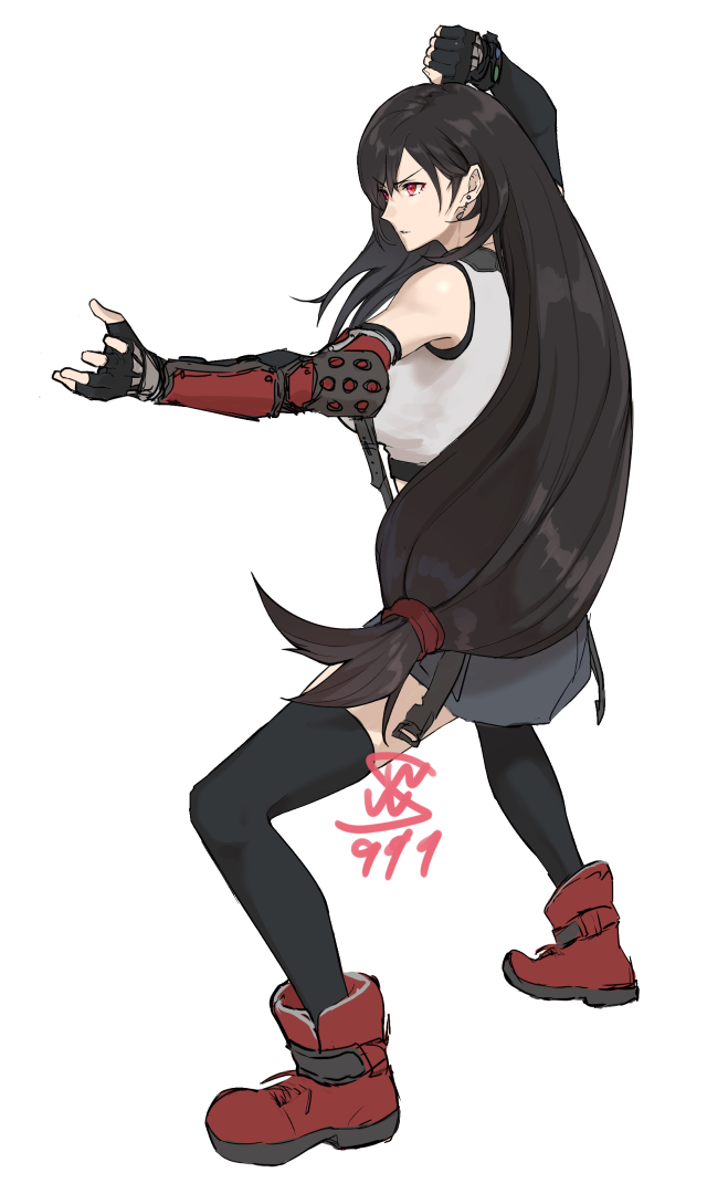 1girl arm_up bare_shoulders black_gloves black_hair black_skirt black_sports_bra black_thighhighs boots breasts clenched_hand commentary crop_top earrings elbow_gloves fighting_stance final_fantasy final_fantasy_vii final_fantasy_vii_rebirth final_fantasy_vii_remake fingerless_gloves from_behind full_body gloves hair_behind_ear jewelry large_breasts long_hair low-tied_long_hair martial_arts open_hand parted_lips red_boots red_eyes signature single_arm_guard single_earring skirt solo sports_bra standing suspender_skirt suspenders tank_top thighhighs tifa_lockhart very_long_hair wasawa_(wsw_999) white_background white_tank_top