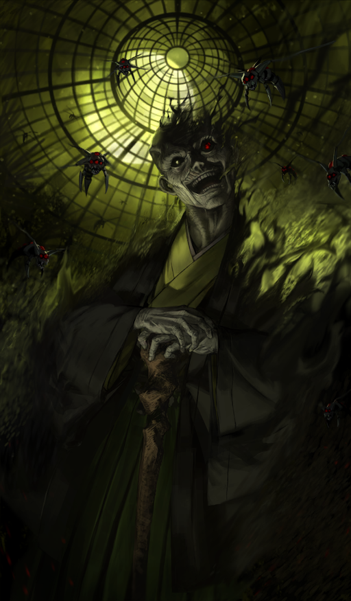 1boy bald black_haori black_sclera bug cane colored_sclera commentary_request cowboy_shot crest_worm dissolving fate/grand_order fate/stay_night fate_(series) from_below glowing glowing_eyes green_hakama green_kimono green_theme hakama haori head_tilt heterochromia holding holding_cane horror_(theme) japanese_clothes kimono long_sleeves male_focus matou_zouken no_eyebrows official_art old old_man open_mouth own_hands_together peperon_(peperou) red_eyes smoke solo teeth third-party_source white_eyes wide_sleeves wrinkled_skin