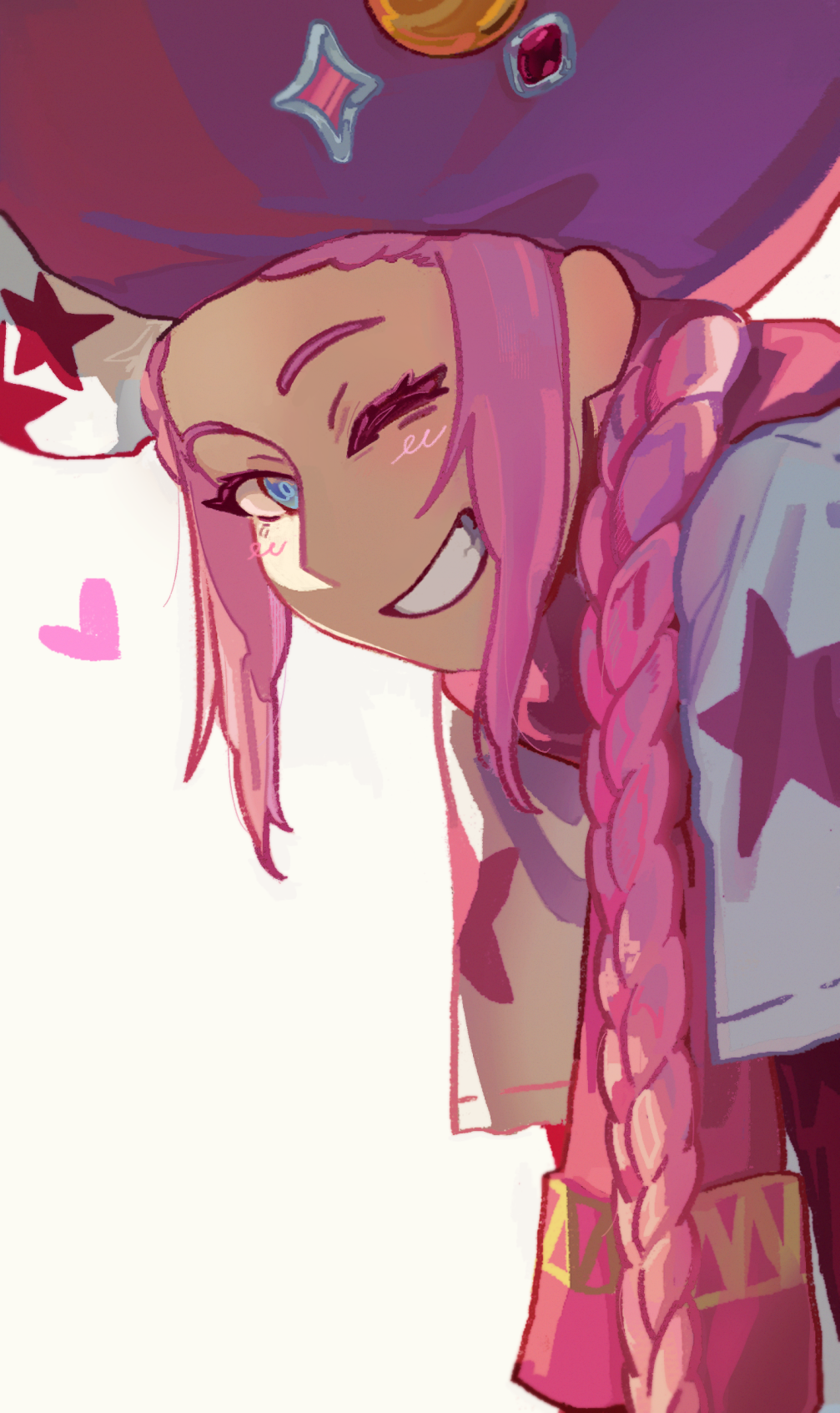 1boy blue_eyes blush braid classicaloid ded-lime grin hat heart highres looking_at_viewer male_focus one_eye_closed pink_hair pink_hat shirt simple_background smile white_background white_shirt wolfgang_amadeus_mozart_(classicaloid)