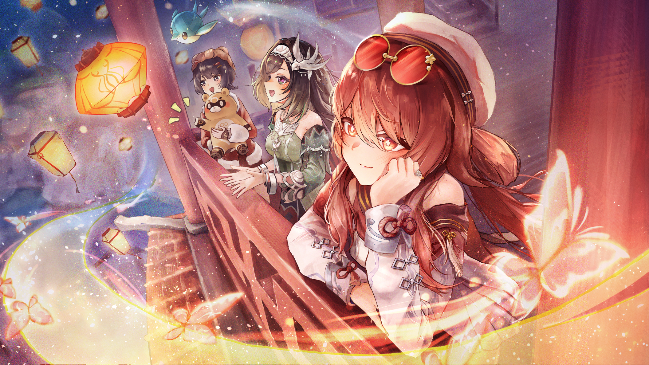 3girls bare_shoulders beret black_hair bracelet brown_hair chinese_clothes detached_sleeves dress eyewear_on_head fur-trimmed_jacket fur_trim genshin_impact green_dress guoba_(genshin_impact) hair_between_eyes hair_ornament hairband hat highres hu_tao_(cherries_snow-laden)_(genshin_impact) hu_tao_(genshin_impact) jacket jewelry lan_yan_(genshin_impact) lantern long_hair minamo_(edosei_edo) multiple_girls red_eyes red_jacket round_eyewear short_hair white_dress white_hat xiangling_(genshin_impact) xiangling_(new_year's_cheer)_(genshin_impact)