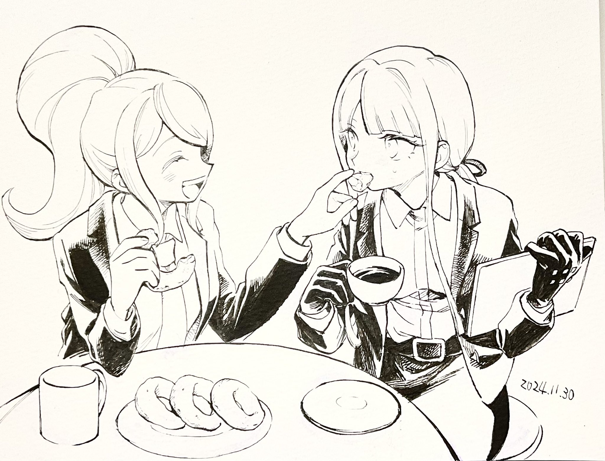 2girls ^_^ asahina_aoi belt belt_buckle blazer blunt_bangs blush buckle clipboard closed_eyes collared_jacket collared_shirt cup danganronpa_(series) danganronpa_3_(anime) dated elbow_on_table eyelashes feeding greyscale hair_ribbon happy highres holding holding_clipboard holding_cup jacket kirigiri_kyoko lapels layered_sleeves long_hair long_sidelocks long_sleeves looking_at_another miniskirt monochrome mug multiple_girls necktie nib_pen_(medium) no+bi= notched_lapels on_stool open_clothes open_jacket pen_(medium) pencil_skirt photo_(medium) ponytail ribbon saucer shirt sidelocks sitting skirt stool straight_hair studded_gloves sweatdrop tea teacup teeth traditional_media upper_teeth_only