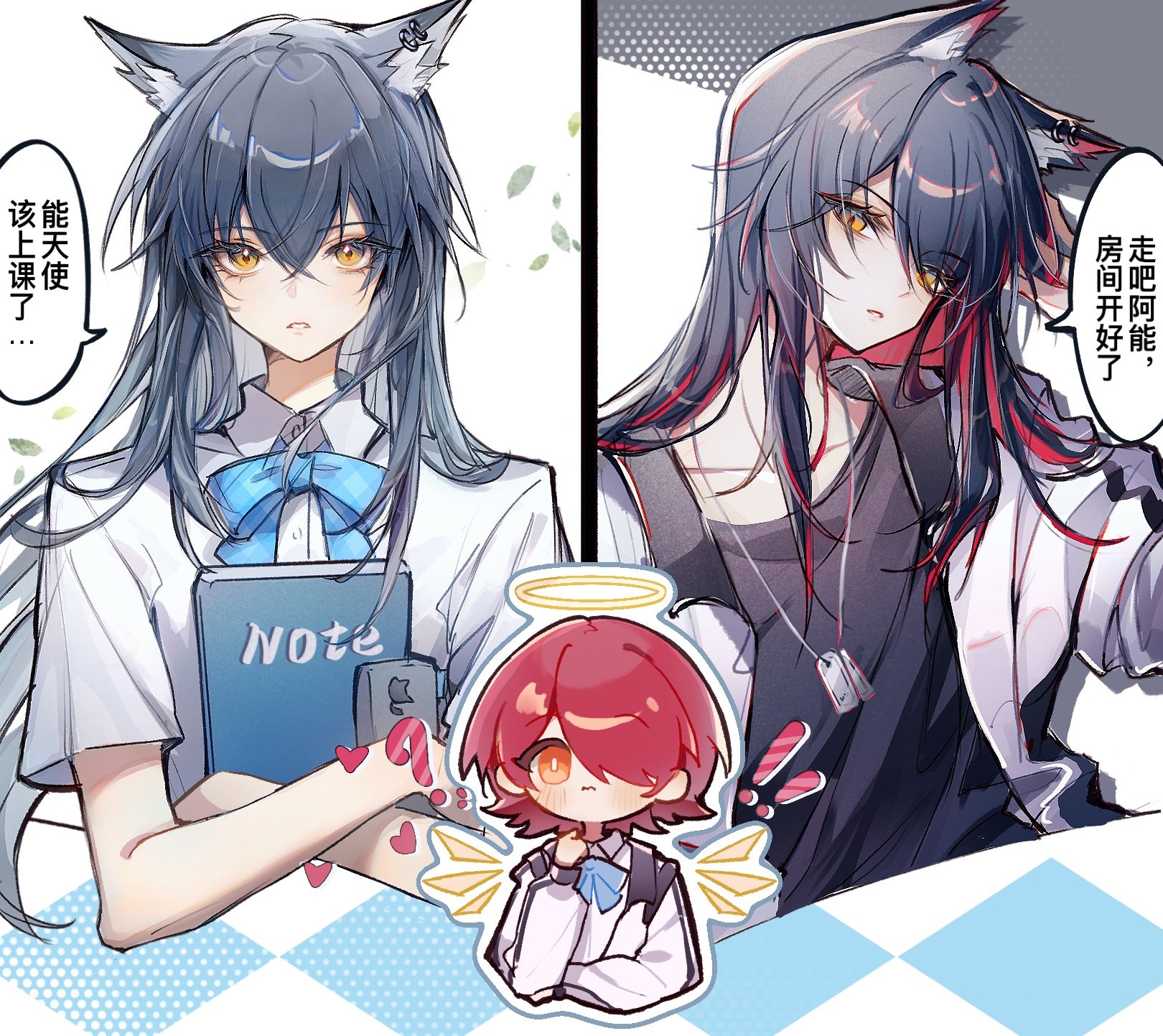 ! !! 3girls ? animal_ear_fluff animal_ear_piercing animal_ears arknights black_hair black_shirt blue_bow blue_bowtie blush bow bowtie bright_pupils chibi chinese_commentary chinese_text clone closed_mouth collarbone collared_shirt colored_inner_hair commentary_request crossed_bangs detached_wings exusiai_(arknights) hair_between_eyes hair_over_one_eye halftone halo head_tilt heart highres jacket long_hair long_sleeves looking_at_viewer multicolored_hair multiple_girls one_eye_covered open_clothes open_jacket parted_lips plaid_bow plaid_bowtie plaid_clothes red_hair shirt short_hair short_sleeves speech_bubble t-shirt tency_(1733djy) texas_(arknights) traditional_halo translation_request white_jacket white_pupils white_shirt wings wolf_ears wolf_girl yellow_eyes yellow_halo