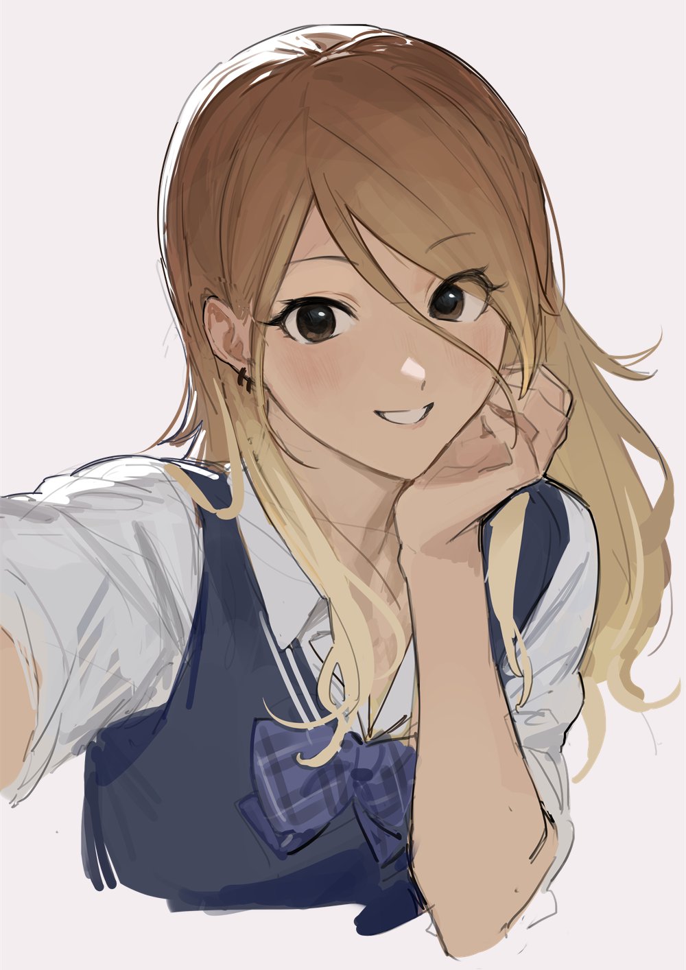 1girl black_eyes blonde_hair blue_bow blue_bowtie blue_sweater_vest bow bowtie brown_hair earrings grey_background gyaru hair_over_one_eye highres holding idolmaster idolmaster_shiny_colors izumi_mei jewelry long_hair looking_at_viewer multicolored_hair shirt simple_background sketch smile sweater_vest tan white_shirt zhili_xingzou