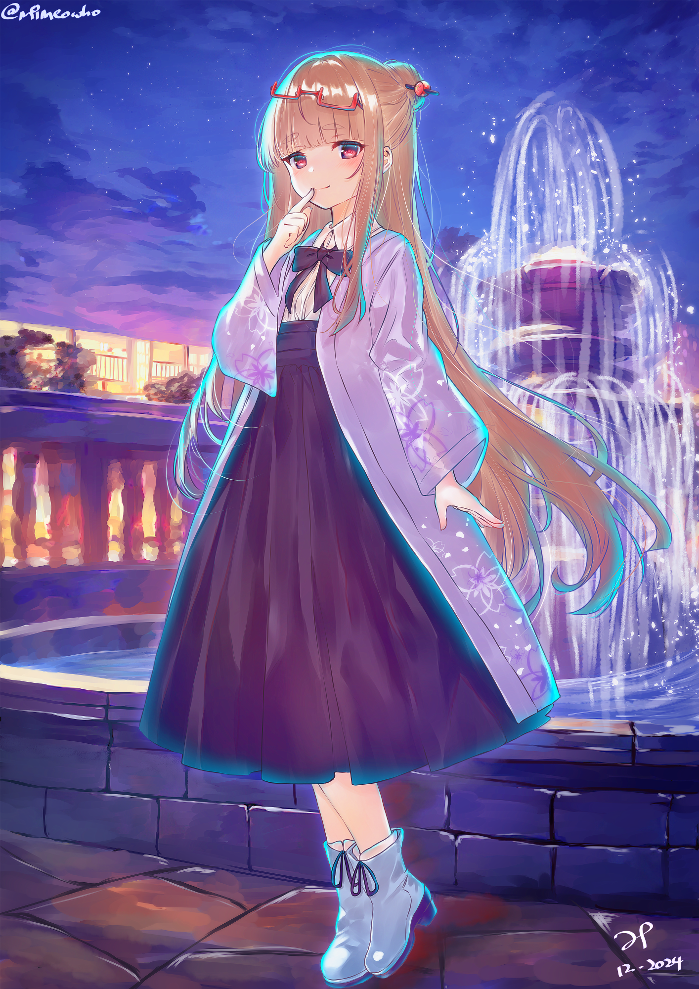 1girl battle_girl_high_school black_bow blunt_bangs blush bow closed_mouth commentary_request commission fountain fujimiya_sakura glasses hair_bun highres long_hair long_sleeves looking_at_viewer mimeowho night outdoors pixiv_commission purple_skirt red_eyes shirt shoes skirt solo white_shirt white_shoes