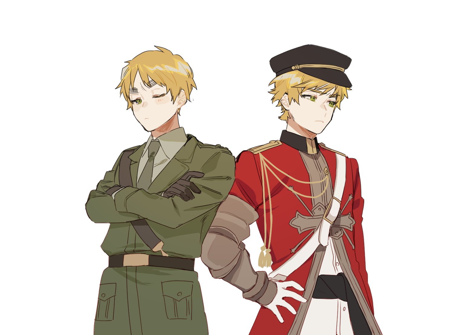 2boys axis_powers_hetalia belt black_belt black_gloves black_hat blonde_hair blush breast_pocket brown_bess_(senjuushi) buttons closed_mouth collared_shirt commentary_request crossed_arms crossover gloves green_eyes green_jacket green_necktie green_shirt hand_on_own_hip hat jacket lapels long_sleeves looking_at_viewer male_focus military_hat military_jacket military_uniform multiple_boys necktie one_eye_closed pocket red_jacket sash senjuushi_(series) shirt short_hair simple_background tabe_gm6 united_kingdom_(hetalia) white_background white_gloves white_sash white_shirt