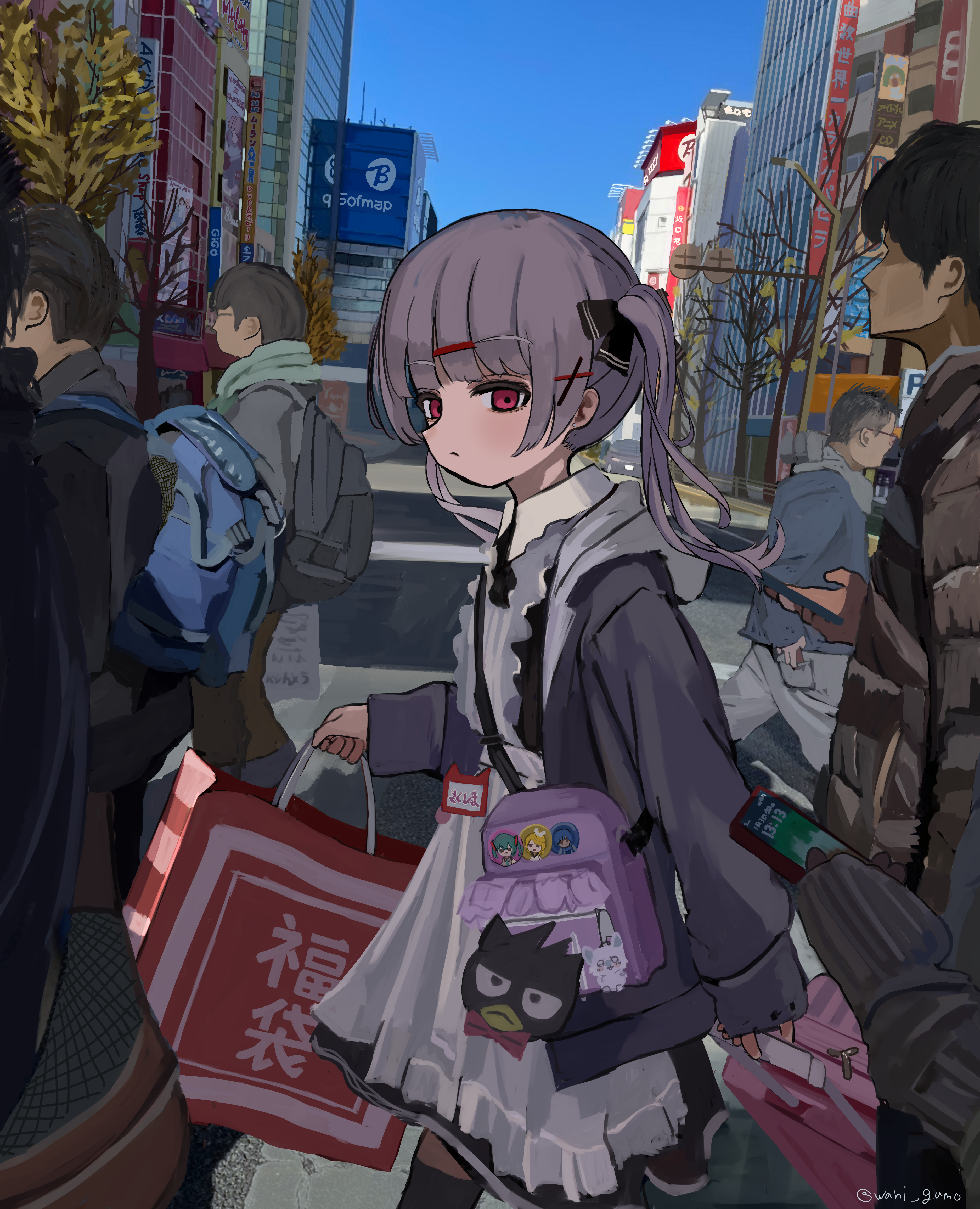 1girl 5boys absurdres akihabara_(tokyo) apron backpack badge bag bare_tree black_dress black_jacket blue_sky building button_badge cellphone city collared_dress dress faceless faceless_male hair_ornament hairclip highres holding holding_phone jacket maid maid_apron multiple_boys name_tag open_clothes open_jacket original outdoors phone purple_hair red_eyes road scarf shopping_bag sideways_glance sky smartphone solo_focus street tokyo_(city) tree twintails wanigumo