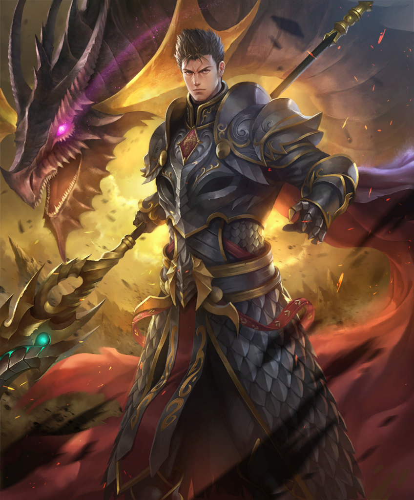 1boy armor blonde_hair claws company_name dragon facial_hair fuji_q full_armor glowing glowing_eyes hair_slicked_back holding holding_polearm holding_weapon looking_at_viewer male_focus official_art polearm rowen_(shadowverse) scar scar_on_face scar_on_nose shadowverse short_hair shoulder_armor solo standing third-party_source weapon