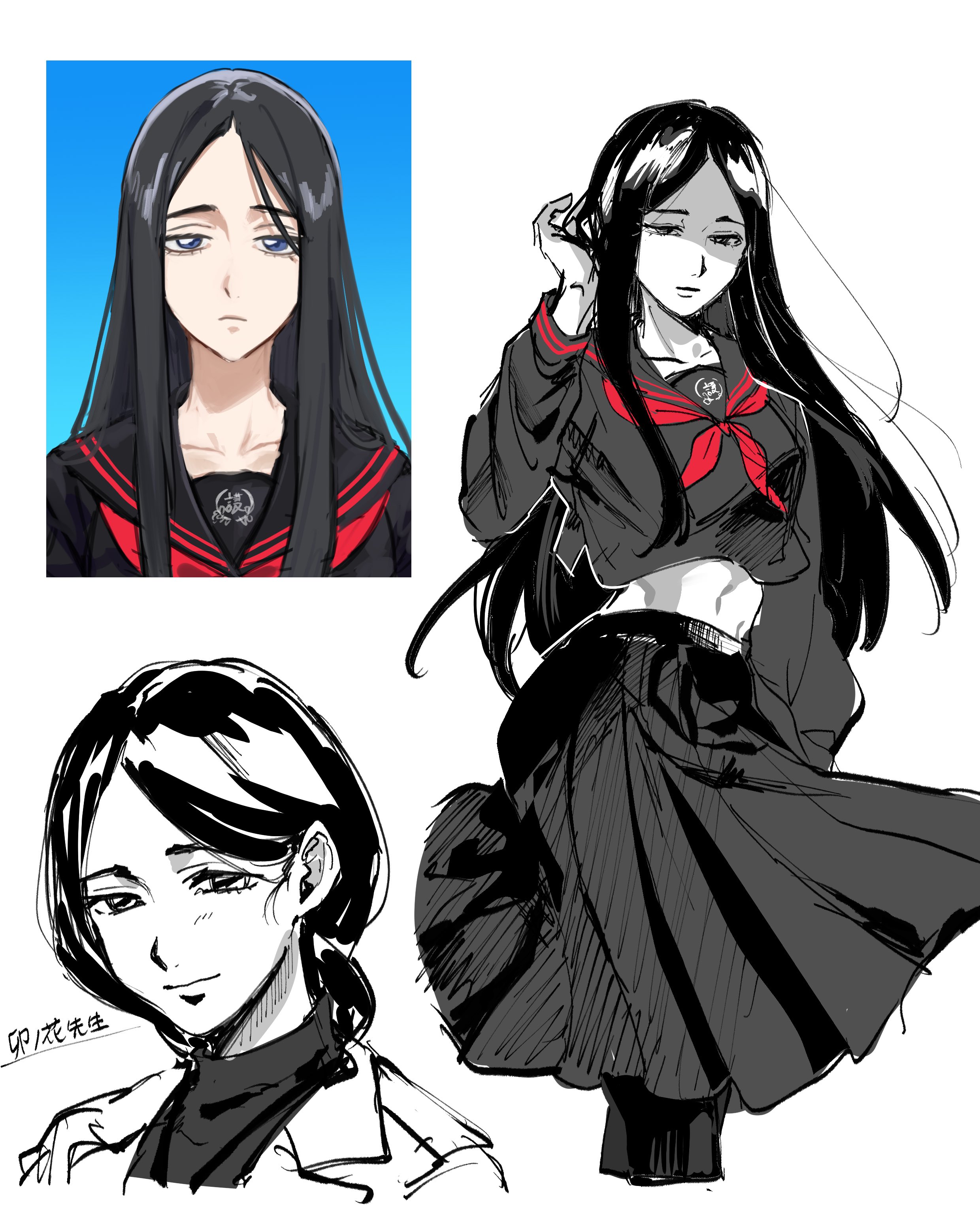 1girl absurdres alternate_costume black_hair black_serafuku black_shirt black_skirt bleach bleach:_sennen_kessen-hen blue_eyes braid closed_mouth collarbone commentary_request crop_top hand_in_own_hair hand_up highres light_smile long_hair long_sleeves midriff multiple_views navel neckerchief parted_bangs red_neckerchief school_uniform serafuku shaded_face shirt sidelocks single_braid sketch skirt unohana_retsu very_long_hair white_background yamabuki0211