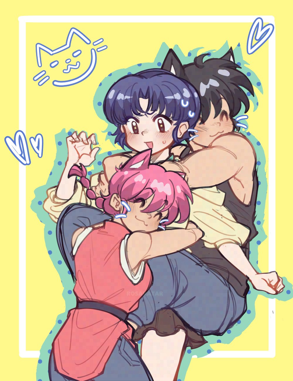2girls blue_hair cat chinese_clothes highres hug multiple_girls open_mouth ranma-chan ranma_1/2 red_hair rosavatar1 saotome_ranma short_hair smile tangzhuang tendou_akane yellow_background