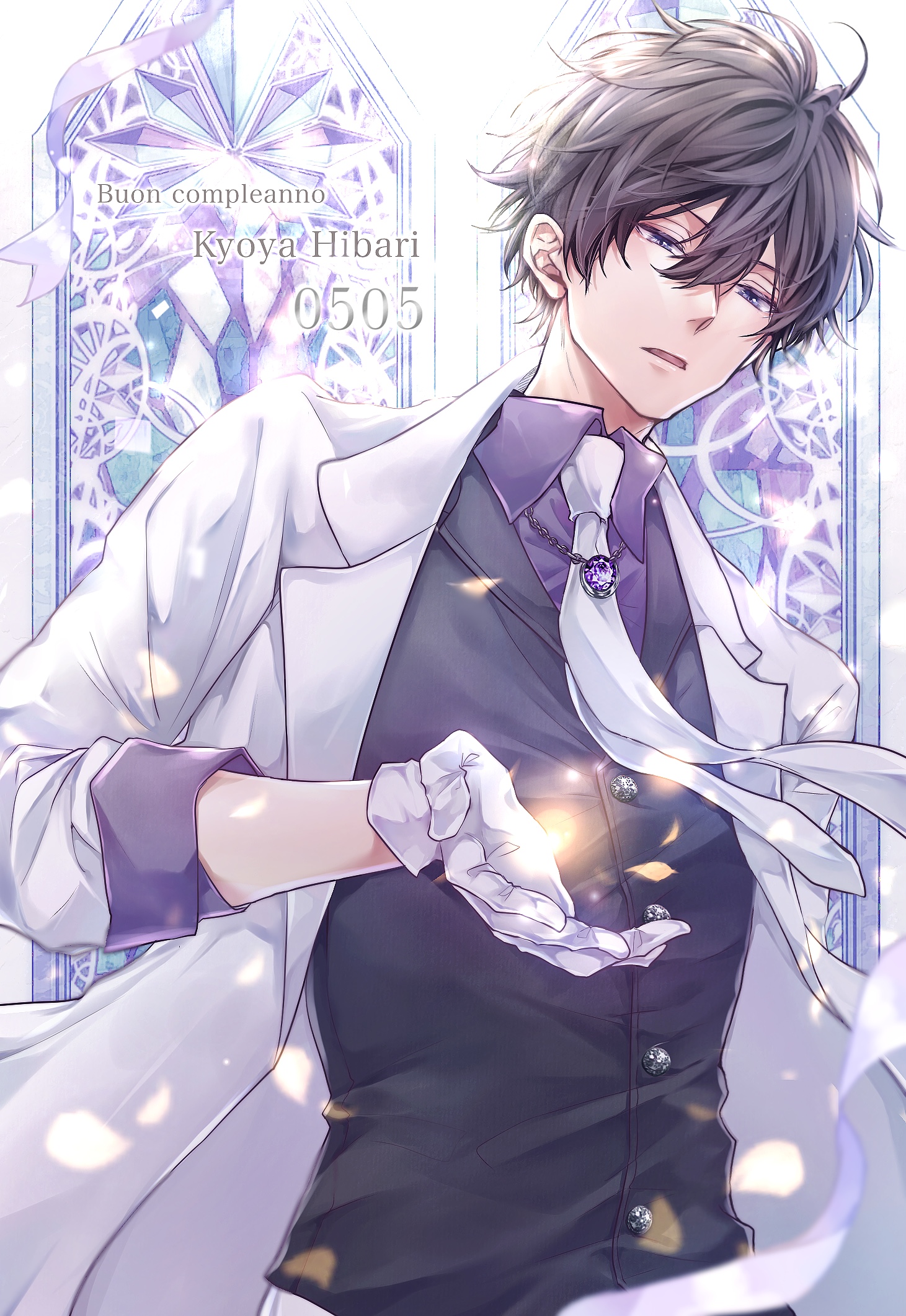 1boy black_hair black_vest blue_eyes commentary formal_clothes gloves happy_birthday hibari_kyouya highres italian_text katekyo_hitman_reborn! looking_at_viewer male_focus necktie open_mouth outstretched_hand purple_shirt rai_dh1218 shirt short_hair solo stained_glass suit vest white_gloves white_necktie white_suit