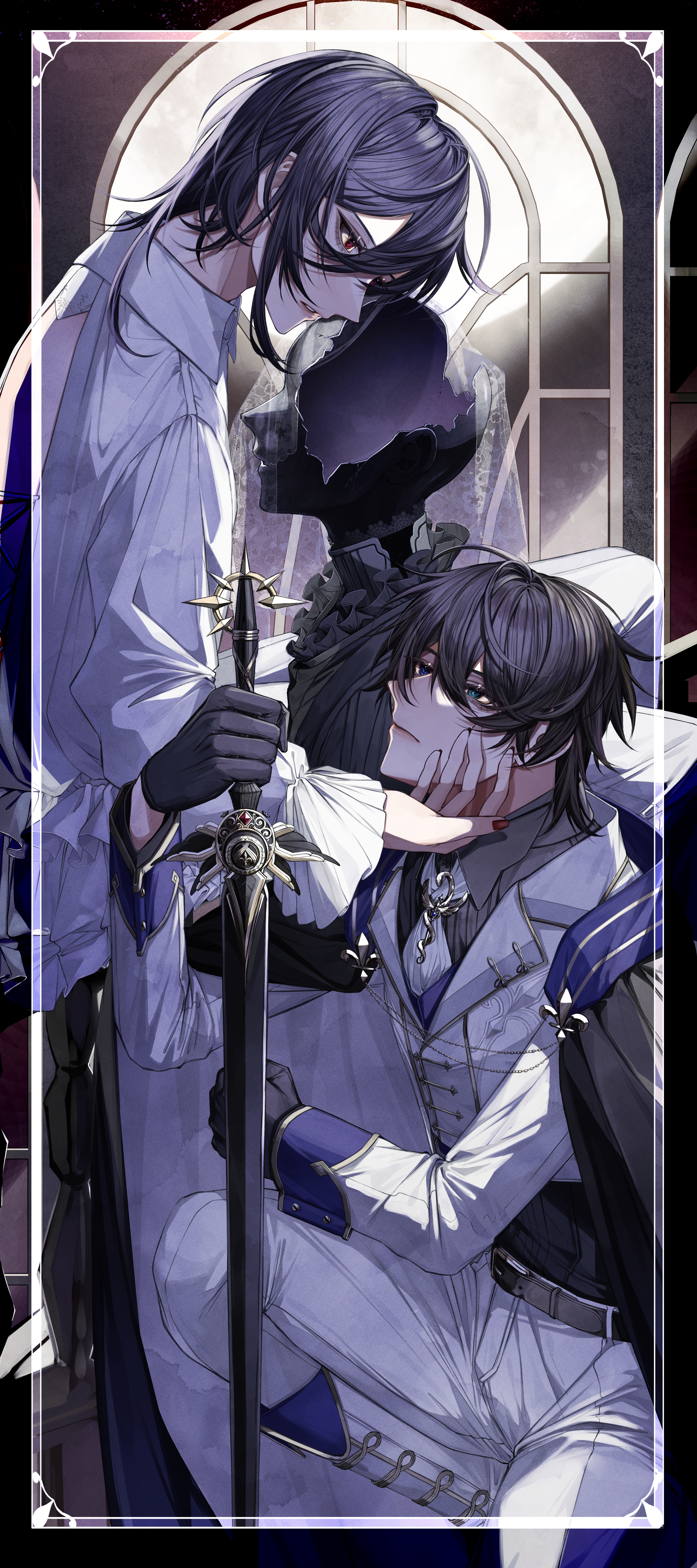 2boys absurdres ahoge aqua_eyes ascot back_cutout black_cape black_gloves black_hair blue_eyes cape clenched_hand closed_mouth clothing_cutout collared_shirt commentary cowboy_shot eyeshadow gloves grey_shirt hair_between_eyes hand_on_another's_face hand_on_own_leg heterochromia highres holding holding_sword holding_weapon jacket looking_at_another looking_down looking_up makeup male_focus multiple_boys on_one_knee original pants parted_lips planted planted_sword planted_weapon red_eyes red_nails shirt short_hair sword teeth weapon white_ascot white_jacket white_pants white_shirt wu_(user_sevs2252)