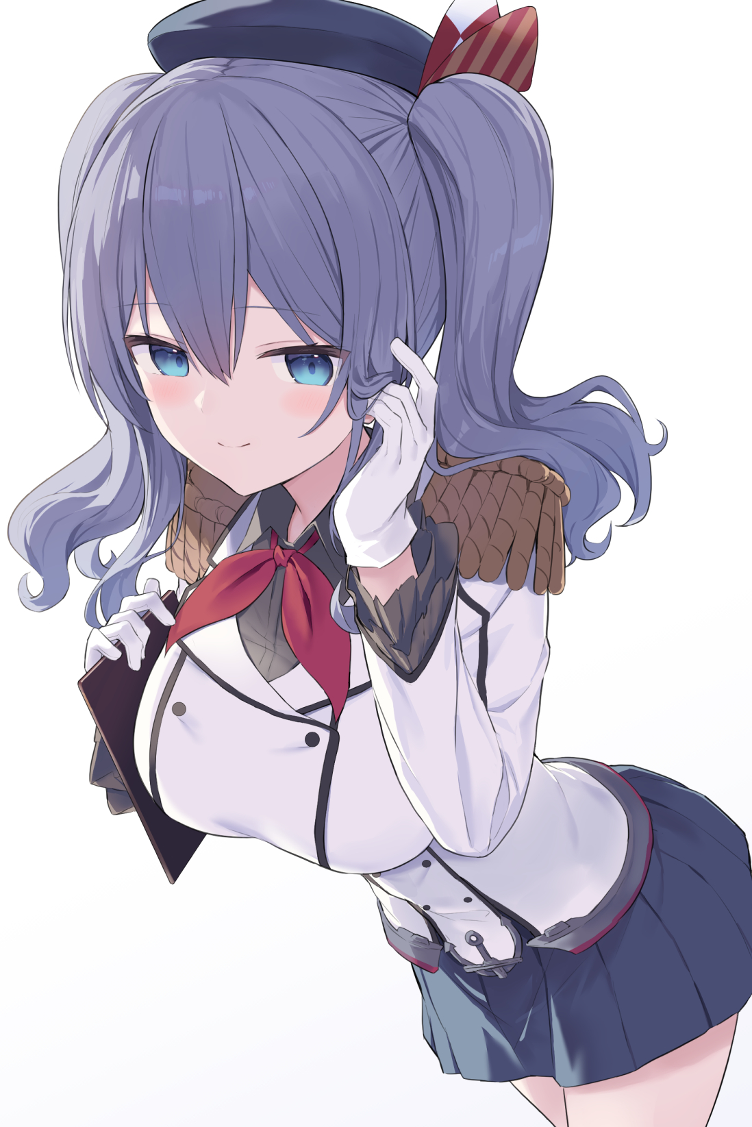 1girl beret blue_eyes breasts clipboard cowboy_shot epaulettes frilled_sleeves frills gloves grey_hair grey_skirt hat highres jacket kantai_collection kashima_(kancolle) large_breasts long_hair long_sleeves looking_at_viewer military_jacket military_uniform neckerchief pleated_skirt red_neckerchief shikuro_(iorimiyakiyo) simple_background skirt solo twintails wavy_hair white_background white_gloves white_jacket