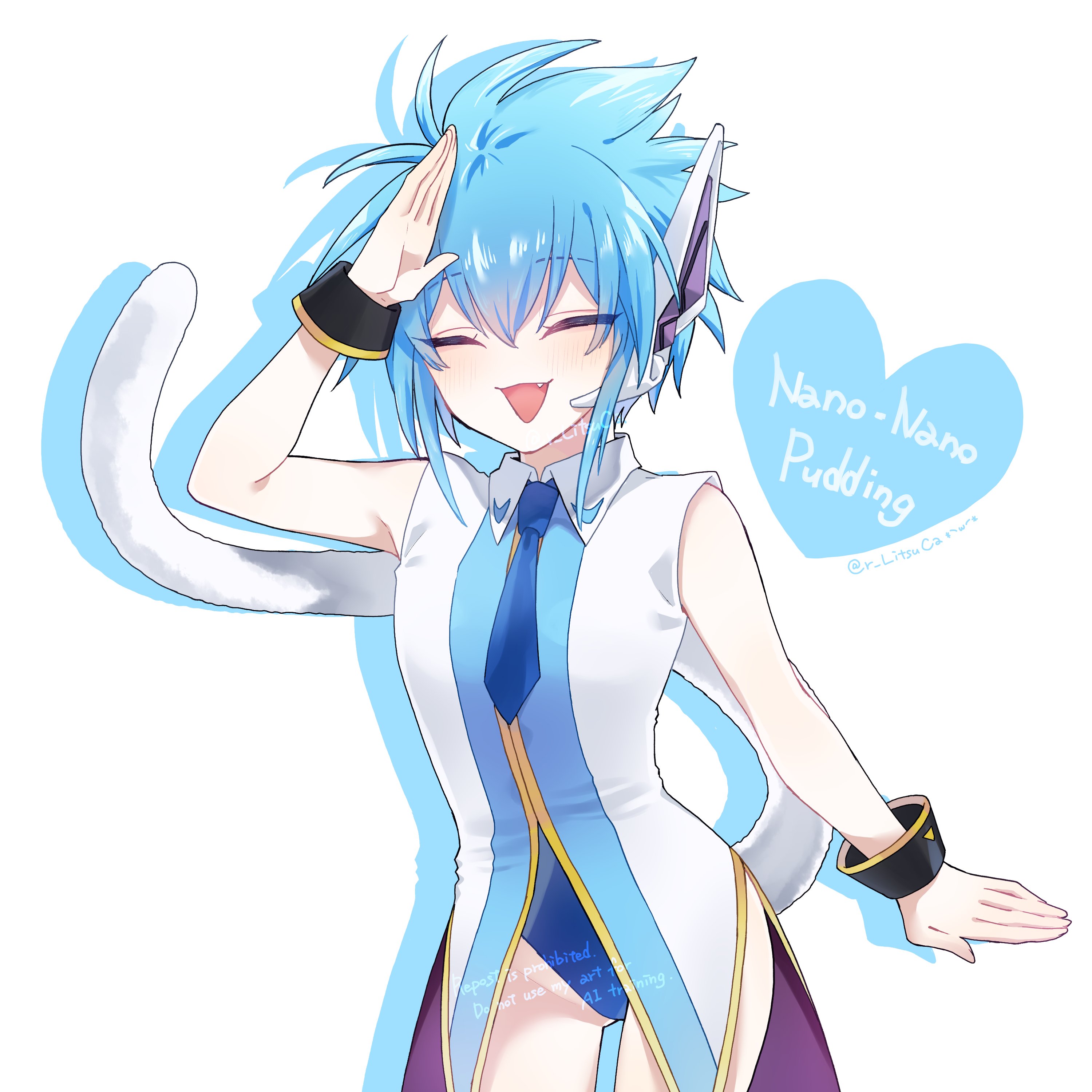 1girl absurdres blue_hair blue_necktie cat_tail character_name cowboy_shot galaxy_angel galaxy_angel_rune gluteal_fold highres nano-nano_pudding necktie ritsu_(r_litsuca) salute short_hair sidelocks sleeveless solo spiked_hair tail thighhighs twitter_username