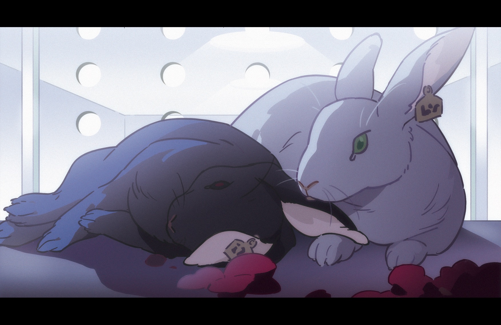 alien_stage black_eyes black_fur chinese_commentary commentary english_commentary flower green_eyes grey_fur highres ivan_(alien_stage) letterboxed lying mixed-language_commentary no_humans on_side rabbit red_flower red_pupils sour_tail till_(alien_stage)