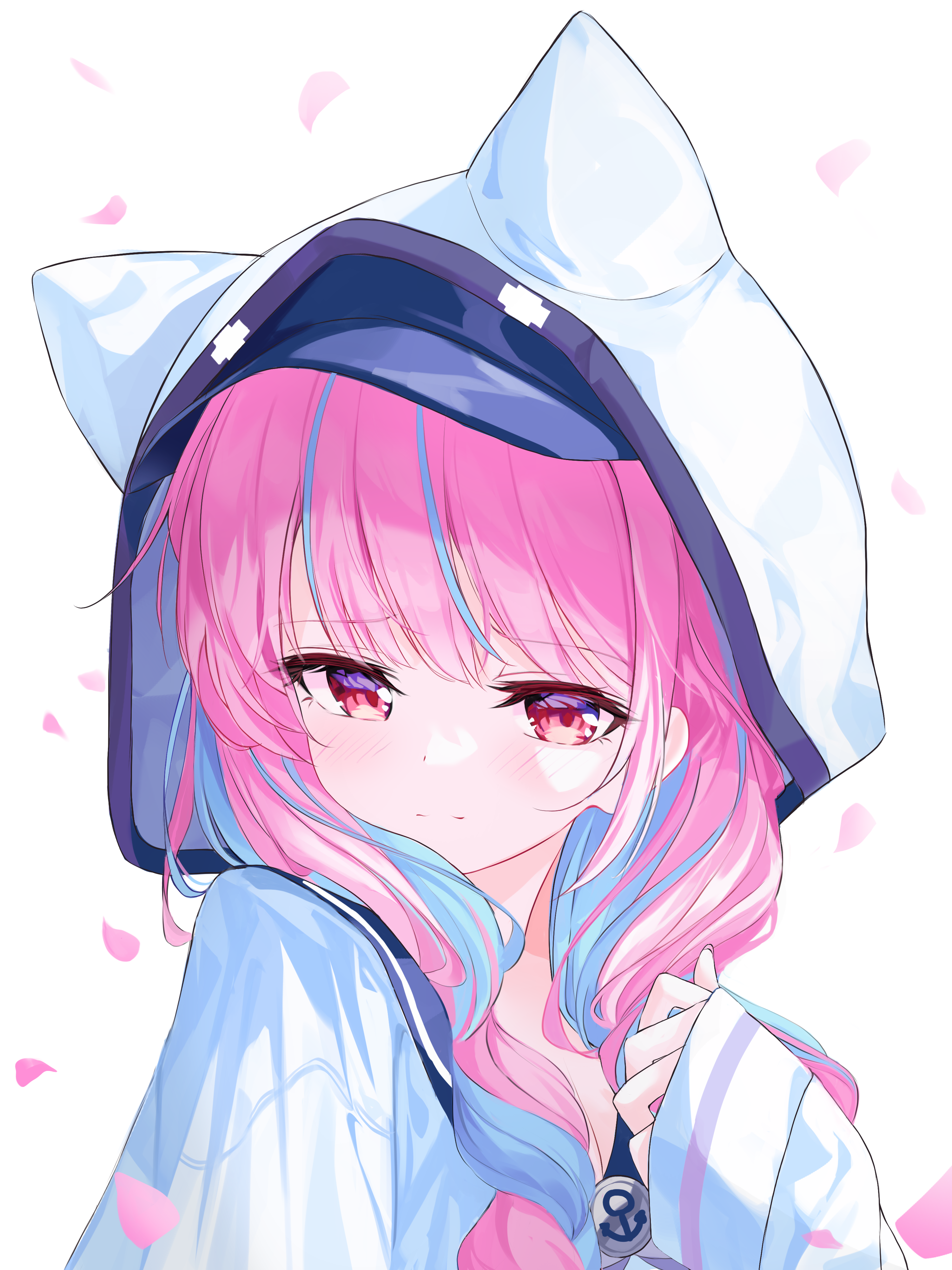 1girl absurdres ahoge anchor_symbol animal_ears animal_hood blush bow braid cat_hood cherry_blossoms colored_inner_hair commentary hand_in_own_hair hat_under_hood highres hololive hood jacket long_hair long_sleeves looking_down minato_aqua minato_aqua_(sailor) multicolored_hair official_alternate_costume pink_hair sailor_collar school_uniform siisii0630 solo twin_braids two-tone_hair virtual_youtuber white_background