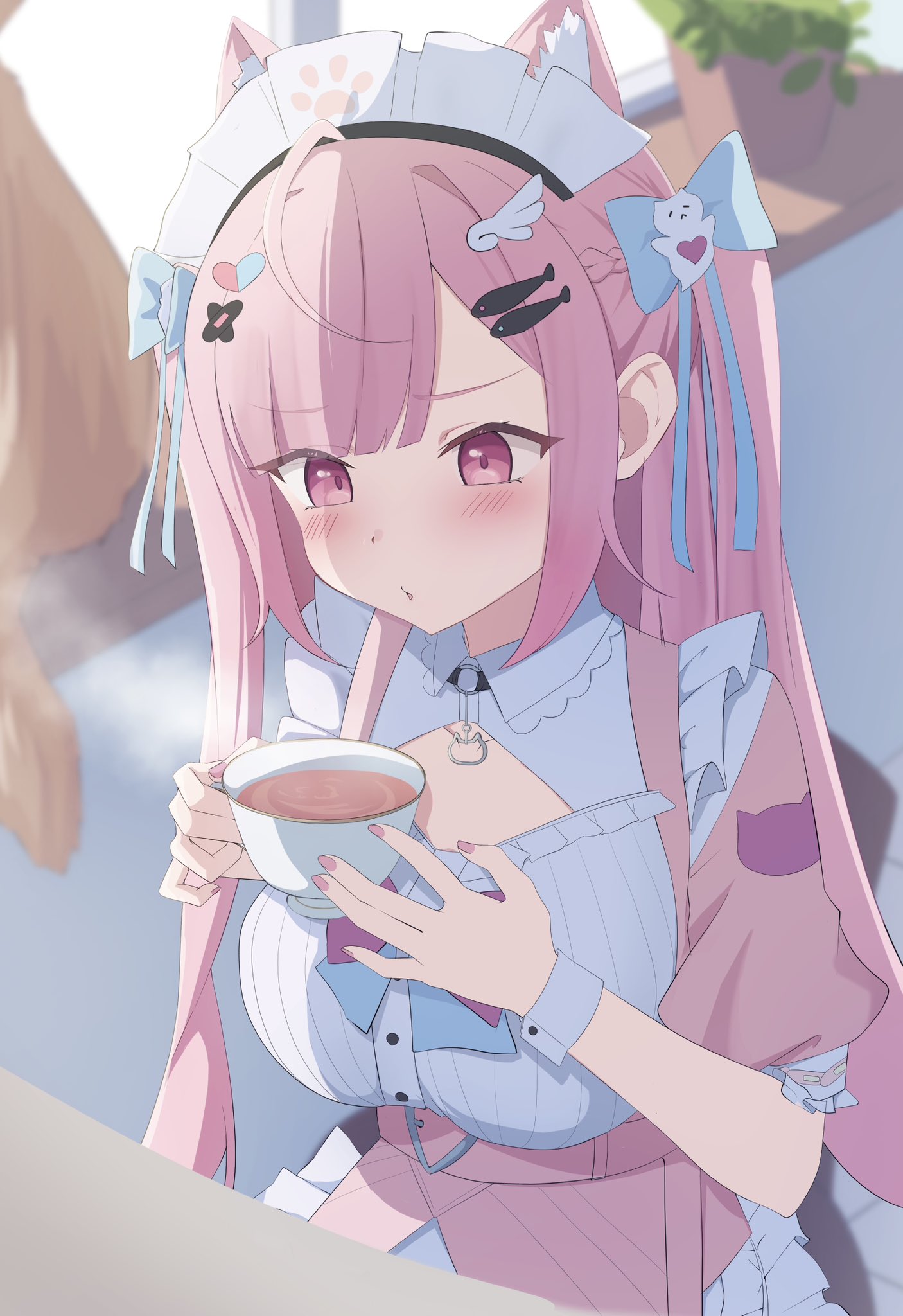 1girl ahoge animal_ears bandaid bandaid_hair_ornament belt blowing blush bow breasts cat_ears cat_girl chest_bow crossed_bandaids cup dress fish_hair_ornament ghost_hair_ornament hair_bow hair_ornament heart heart_hair_ornament highres holding holding_cup indie_virtual_youtuber long_hair looking_at_object maid maid_headdress paw_print paw_print_pattern pink_belt pink_dress pink_eyes pink_hair ponono_desu solo tea two_side_up virtual_youtuber white_wrist_cuffs wing_hair_ornament wing_hairpin wrist_cuffs yuuki_sakuna yuuki_sakuna_(1st_costume)