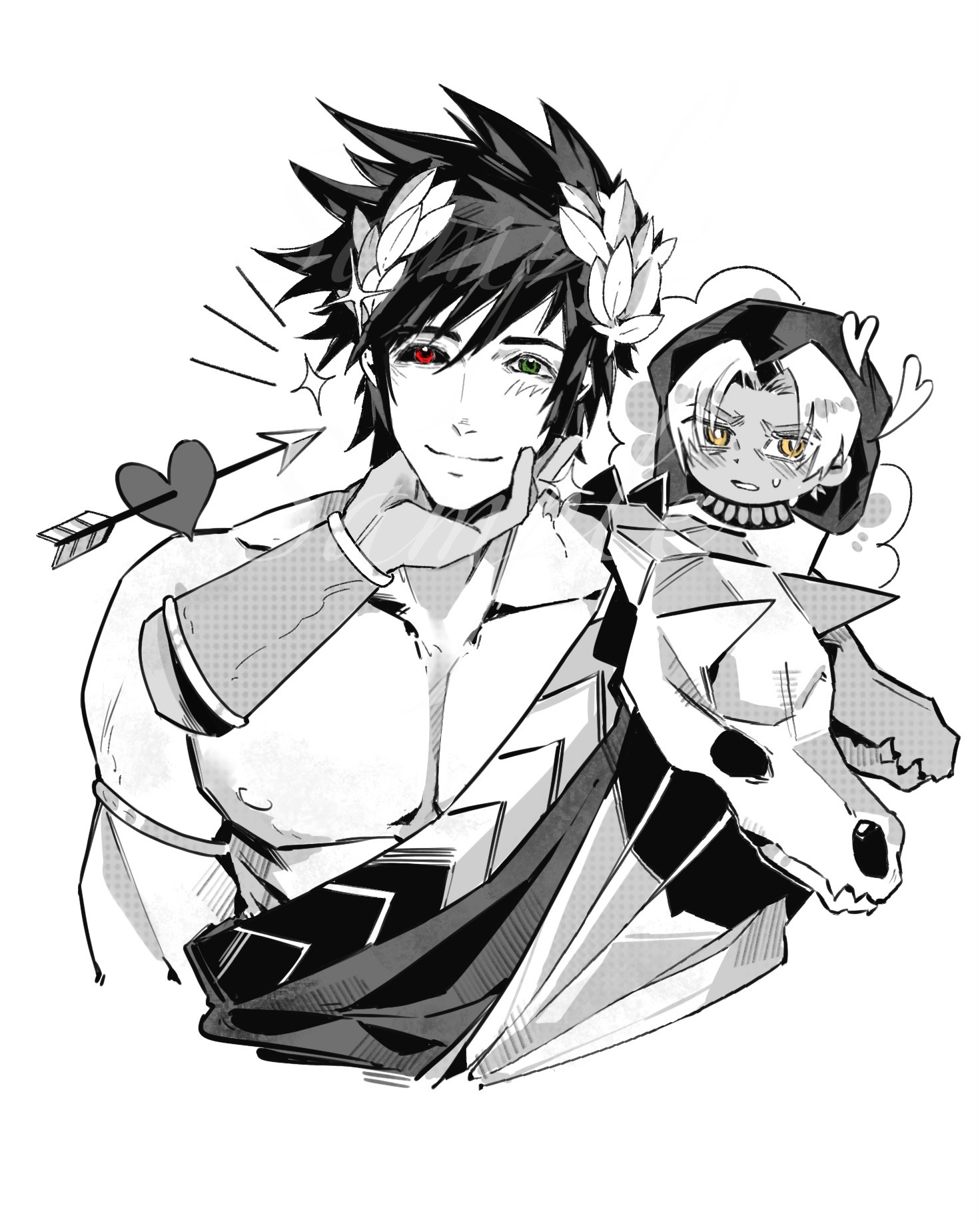 2boys animal_skull arrow_(projectile) arrow_through_heart bare_pectorals black_sclera chinese_commentary closed_mouth collarbone colored_sclera commentary_request curtained_hair greco-roman_clothes green_eyes greyscale hades_(series) hades_1 hand_on_another's_chin heart heterochromia highres hood hood_up looking_at_another looking_to_the_side male_focus monochrome multiple_boys nervous_sweating nipples pectorals red_eyes robe sideways_glance simple_background single_bracer smile spot_color sweat thanatos_(hades) white_background xinjinjumin8218011 yaoi yellow_eyes zagreus_(hades)