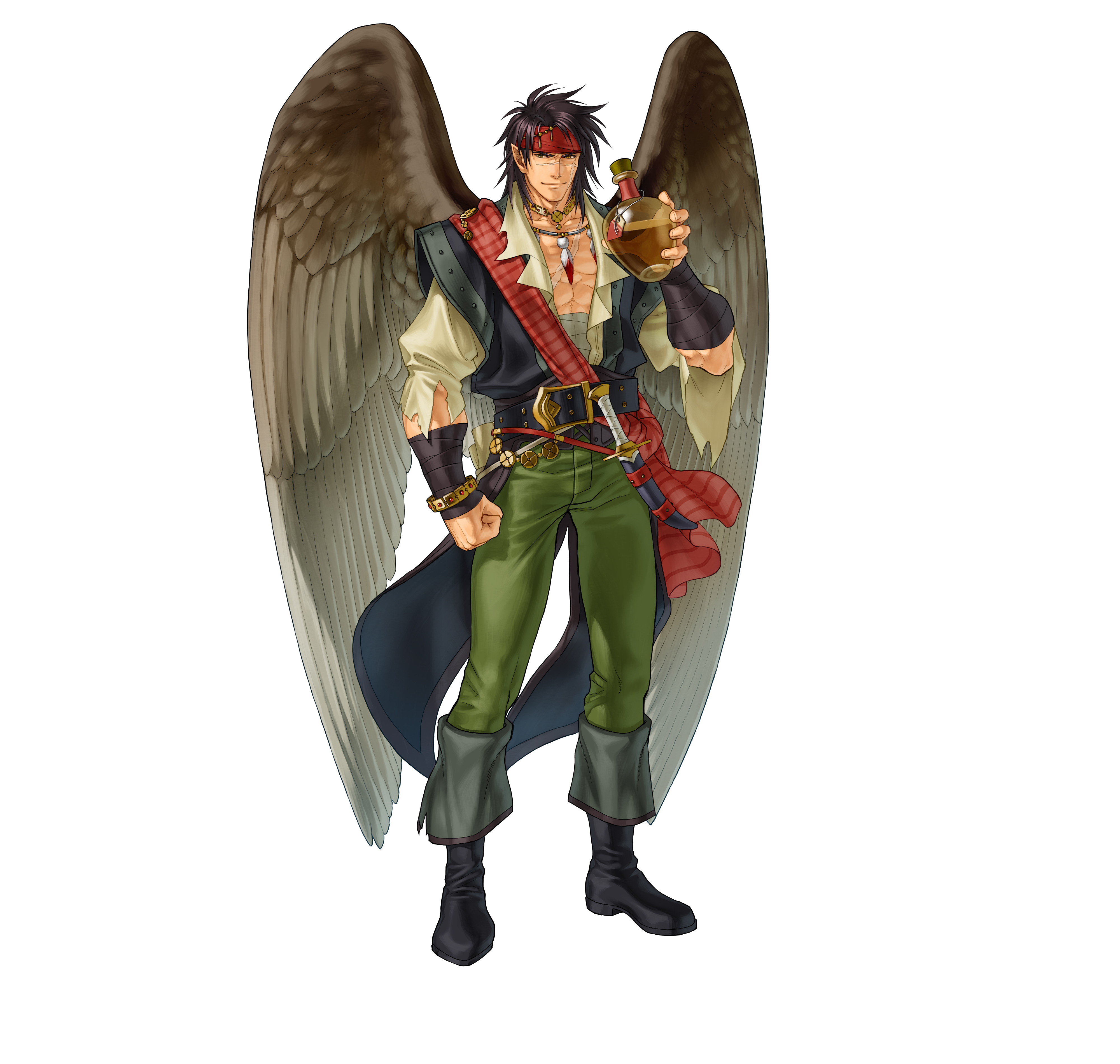 1boy absurdres black_boots black_hair boots bottle bracelet clenched_hand commentary_request feather_necklace feathered_wings fire_emblem fire_emblem:_radiant_dawn fire_emblem_heroes full_body green_pants highres holding holding_bottle jewelry kita_senri looking_at_viewer male_focus medium_hair midriff_sarashi muscular muscular_male necklace nintendo official_art pants pectoral_cleavage pectorals sarashi scar scar_on_chest scar_on_face simple_background solo tibarn_(fire_emblem) tibarn_(pirate)_(fire_emblem) torn_clothes torn_sleeves white_background wings