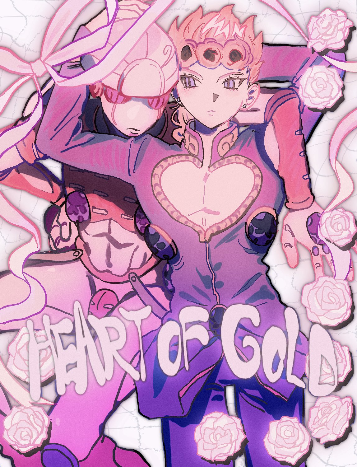 1boy arm_around_neck arm_around_shoulder arm_up bare_pectorals blonde_hair blue_eyes cleavage_cutout closed_mouth clothing_cutout commentary_request flower giorno_giovanna gold_experience grid_background hair_rings hand_on_another's_head highres jacket jojo_no_kimyou_na_bouken long_sleeves looking_to_the_side male_focus pants pectoral_cleavage pectorals purple_jacket purple_pants ribbon rose sideways_glance stand_(jojo) standing tami_tome_mo vento_aureo white_flower