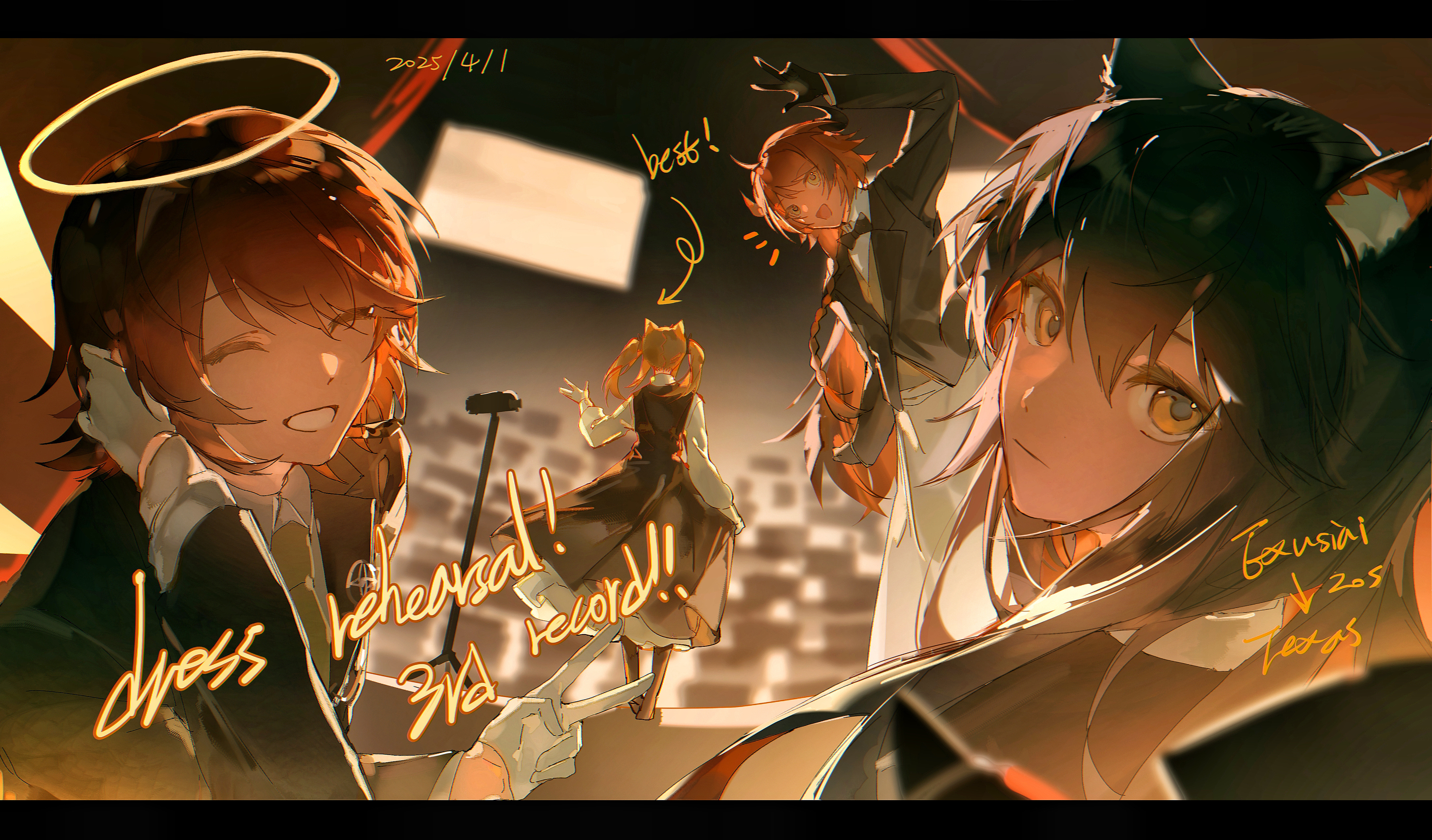 4girls absurdres ambience_synesthesia arknights black_bow black_bowtie black_dress black_gloves black_hair black_jacket bow bowtie braid chinese_commentary closed_eyes collared_shirt commentary_request croissant_(arknights) dated dress english_text exusiai_(ambience_synesthesia_2025)_(arknights) exusiai_(arknights) from_behind gloves highres jacket kuilaogouhuabudongle long_hair long_sleeves looking_at_viewer looking_back multiple_girls orange_hair red_hair scratching_head selfie shirt short_hair smile sora_(arknights) texas_(arknights) v white_gloves white_shirt wings