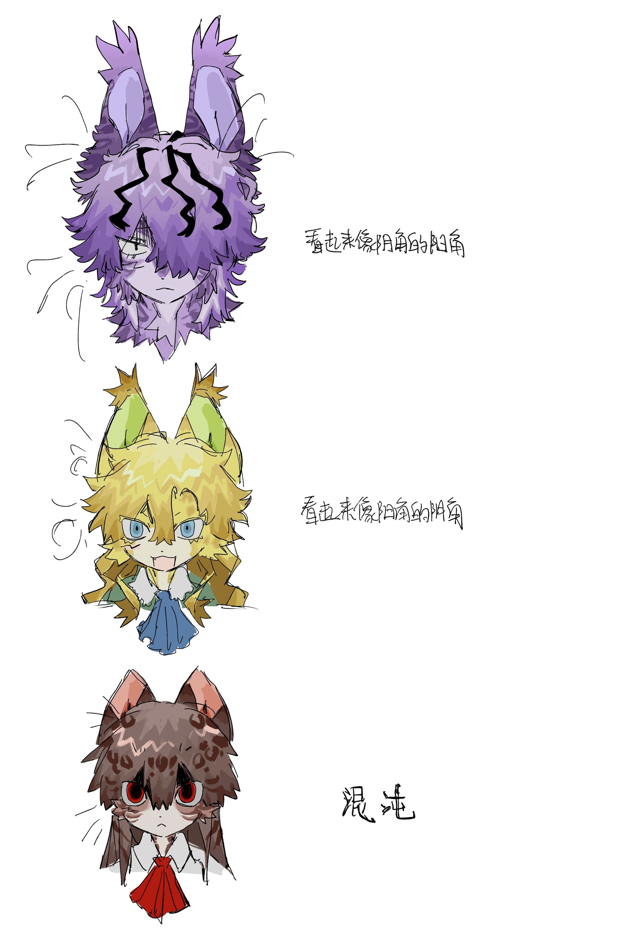 1boy 2girls :3 absurdres ascot blonde_hair blue_ascot blue_eyes brown_hair cat_boy cat_girl chinese_commentary chinese_text closed_mouth collared_shirt commentary_request fang frown furrification furry furry_female furry_male garry_(ib) green_shirt hair_between_eyes hair_over_one_eye highres ib_(ib) ib_(kouri) long_hair mary_(ib) multiple_girls open_mouth purple_fur purple_hair red_ascot red_eyes sanpaku shirt short_hair simple_background sketch smile translation_request tsurime white_background white_shirt xiboliya_suanxing_shengwu