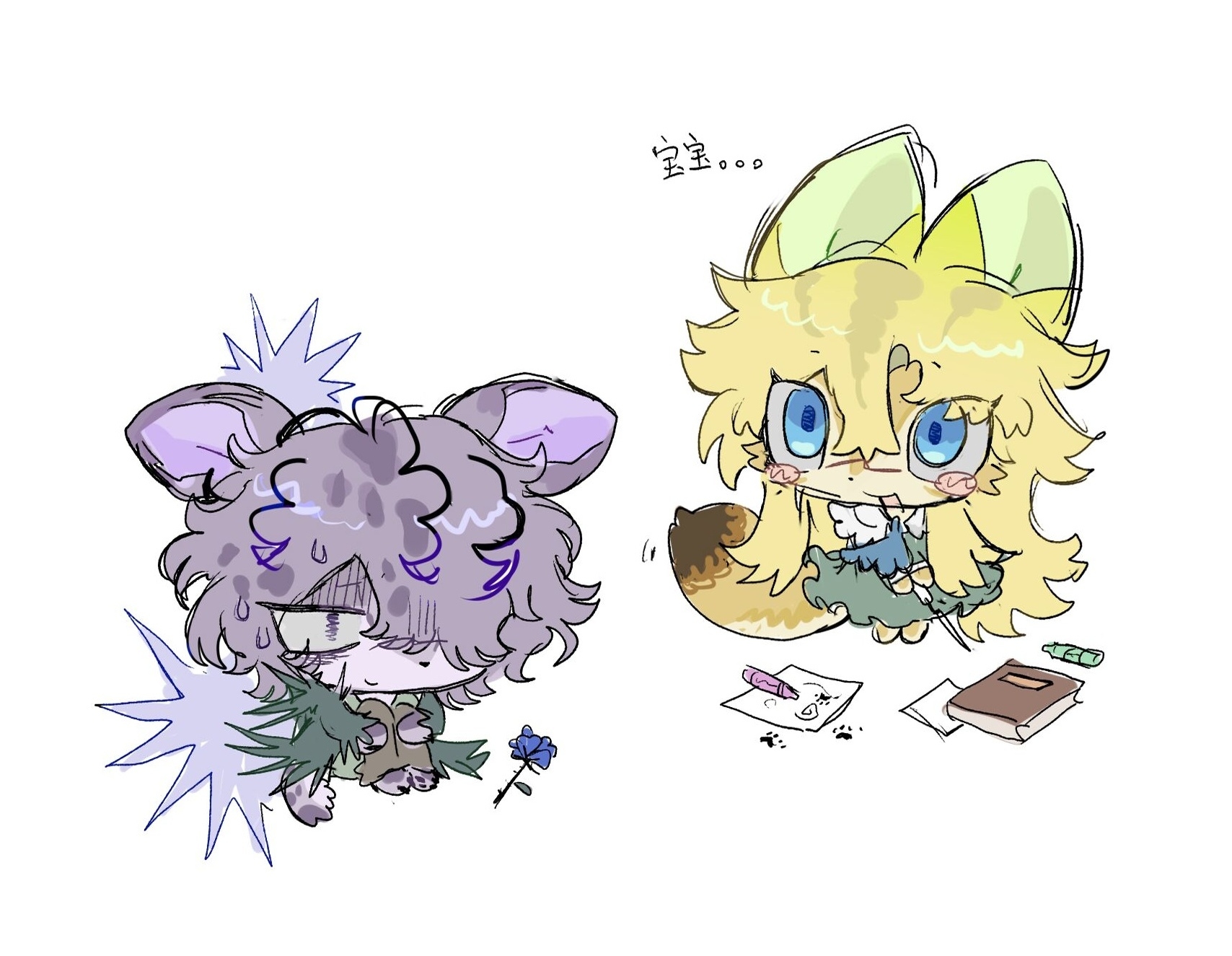 1boy 1girl ascot blonde_hair blue_ascot blue_eyes blue_flower blue_rose blush_stickers brown_pants chibi chibi_only chinese_commentary chinese_text closed_mouth coat collared_dress commentary_request dress flower fox_girl furrification furry furry_female furry_male garry_(ib) green_coat green_dress green_shirt hair_between_eyes highres ib_(kouri) long_sleeves mary_(ib) open_mouth pants paw_print purple_eyes purple_fur purple_hair rose shirt short_hair simple_background sitting smile translation_request white_background xiboliya_suanxing_shengwu yellow_fur