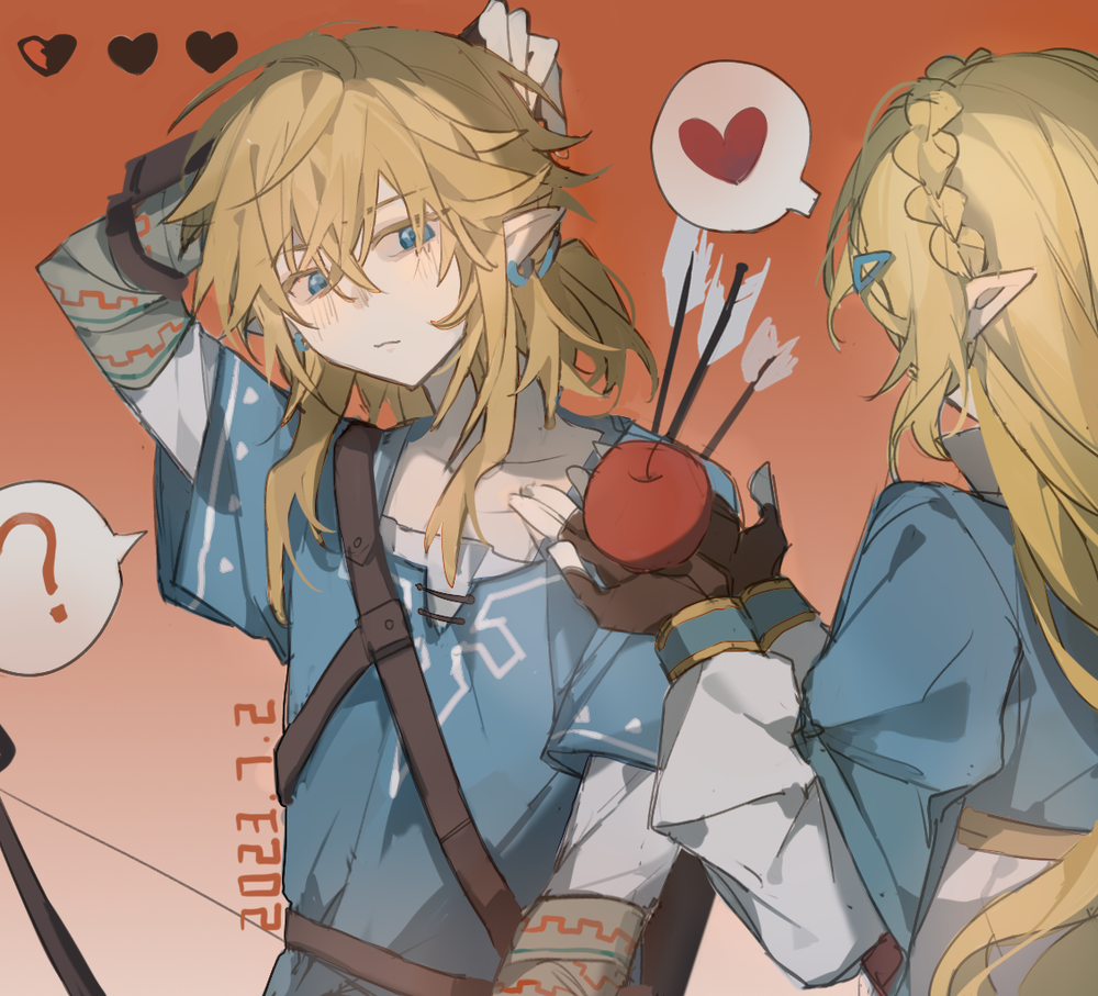 1boy 1girl ? apple arrow_(projectile) black_gloves blonde_hair blue_eyes blue_shirt braid crown_braid dated fingerless_gloves food fruit gloves heart holding holding_food holding_fruit layered_shirt link long_hair nintendo pointy_ears ponytail princess_zelda red_background scratching_head shirt spoken_heart spoken_question_mark the_legend_of_zelda the_legend_of_zelda:_breath_of_the_wild xiaotouminglurenjia