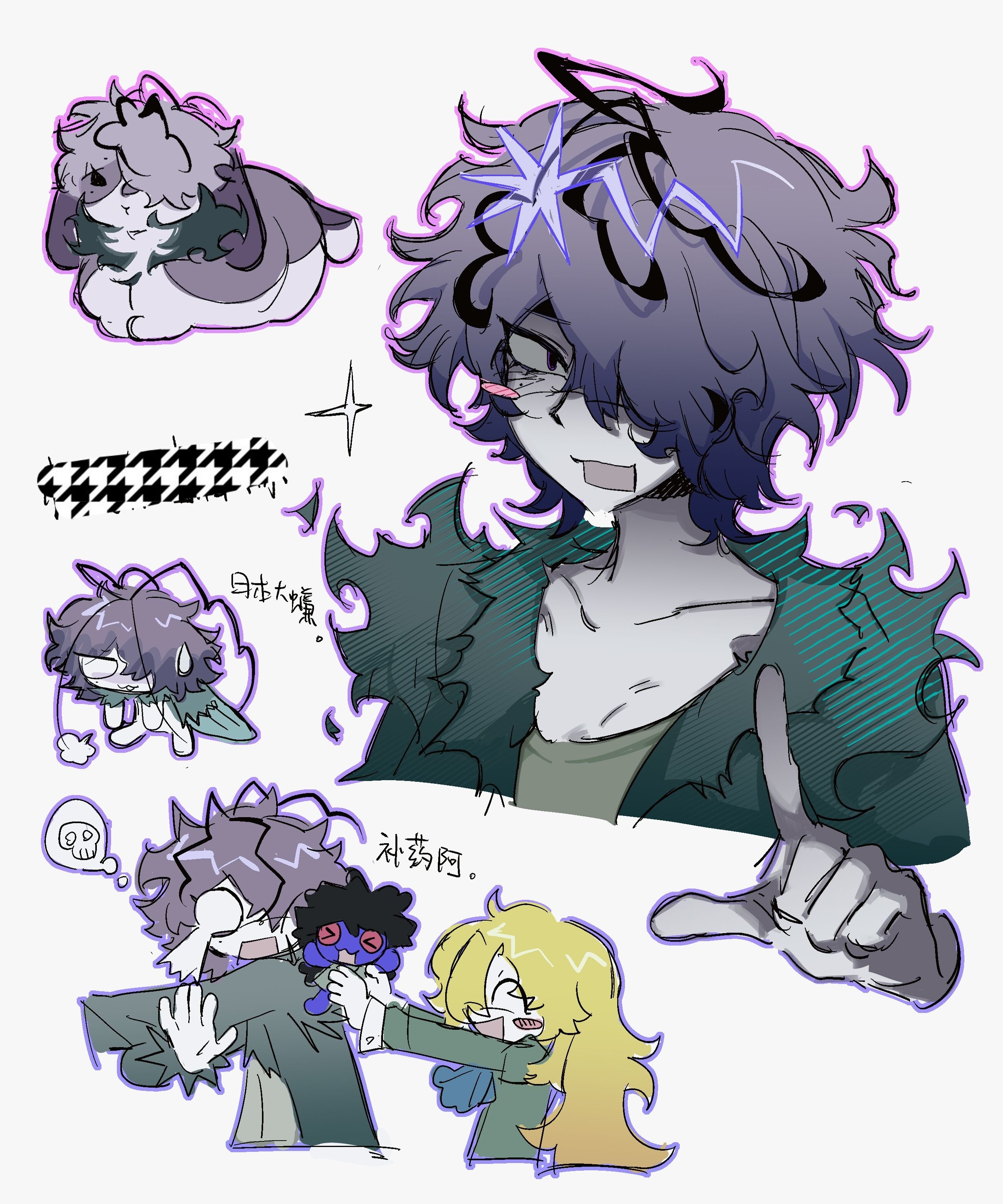 >_< 1boy 1girl ^_^ absurdres animalization ascot black_hair blonde_hair blue_ascot blush_stickers chinese_commentary chinese_text closed_eyes commentary_request crying doll_(ib) garry_(ib) green_jacket green_shirt highres ib_(ib) ib_(kouri) index_finger_raised jacket long_hair mary_(ib) mole mole_under_eye multiple_views o_o open_clothes open_jacket open_mouth outline purple_eyes purple_hair purple_outline rabbit scared shirt simple_background single_blush_sticker smile streaming_tears tears translation_request white_background xiboliya_suanxing_shengwu