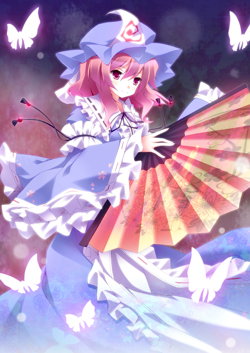 1girl bad_id bad_pixiv_id bug butterfly hand_fan female_focus folding_fan hat bug japanese_clothes kurono_yuzuko pink_eyes pink_hair saigyouji_yuyuko smile solo touhou