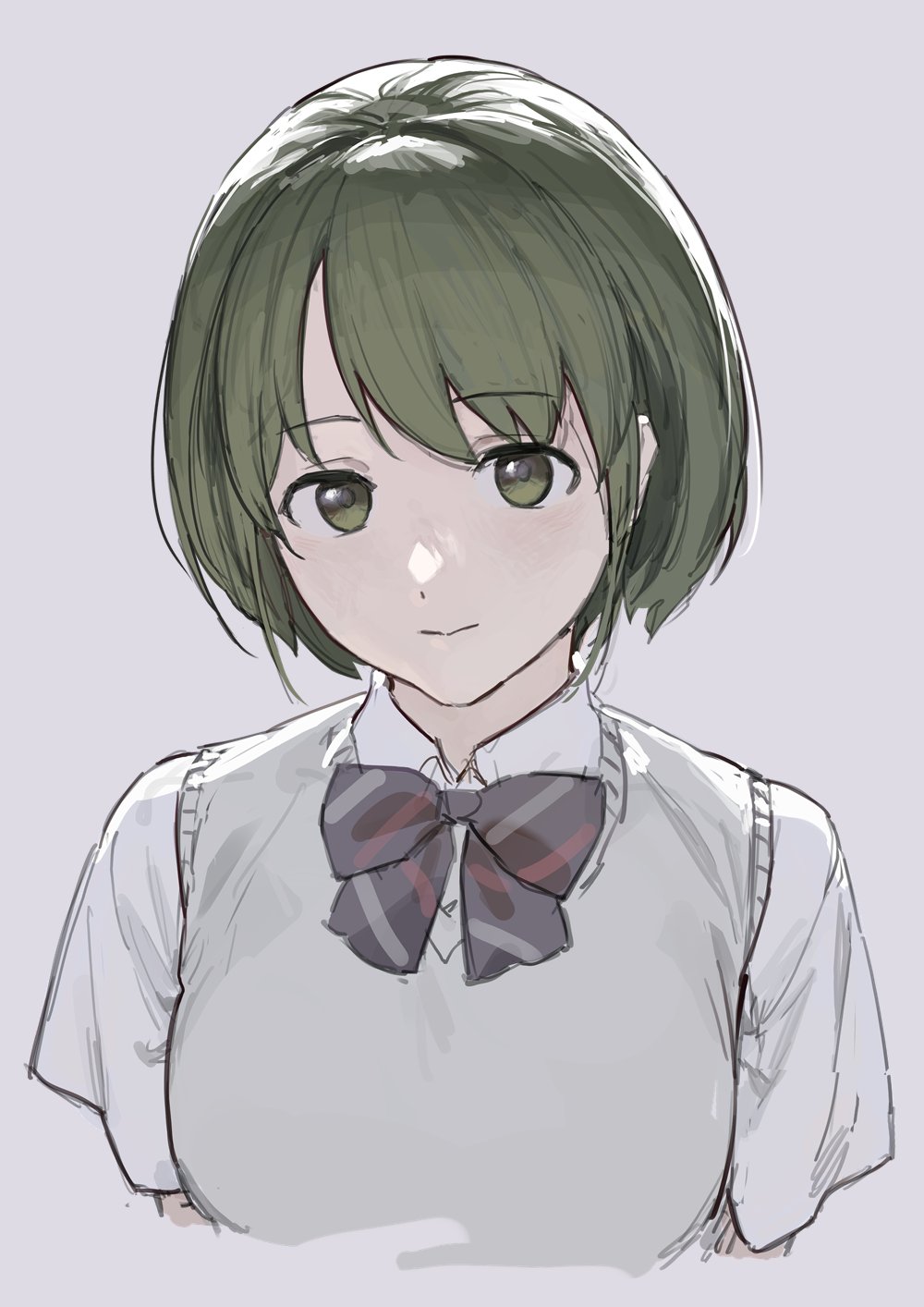1girl blush bow bowtie closed_mouth collared_shirt green_eyes green_hair grey_background highres looking_at_viewer nanakusa_nichika school_uniform shirt short_hair simple_background solo striped_bow upper_body white_shirt zhili_xingzou