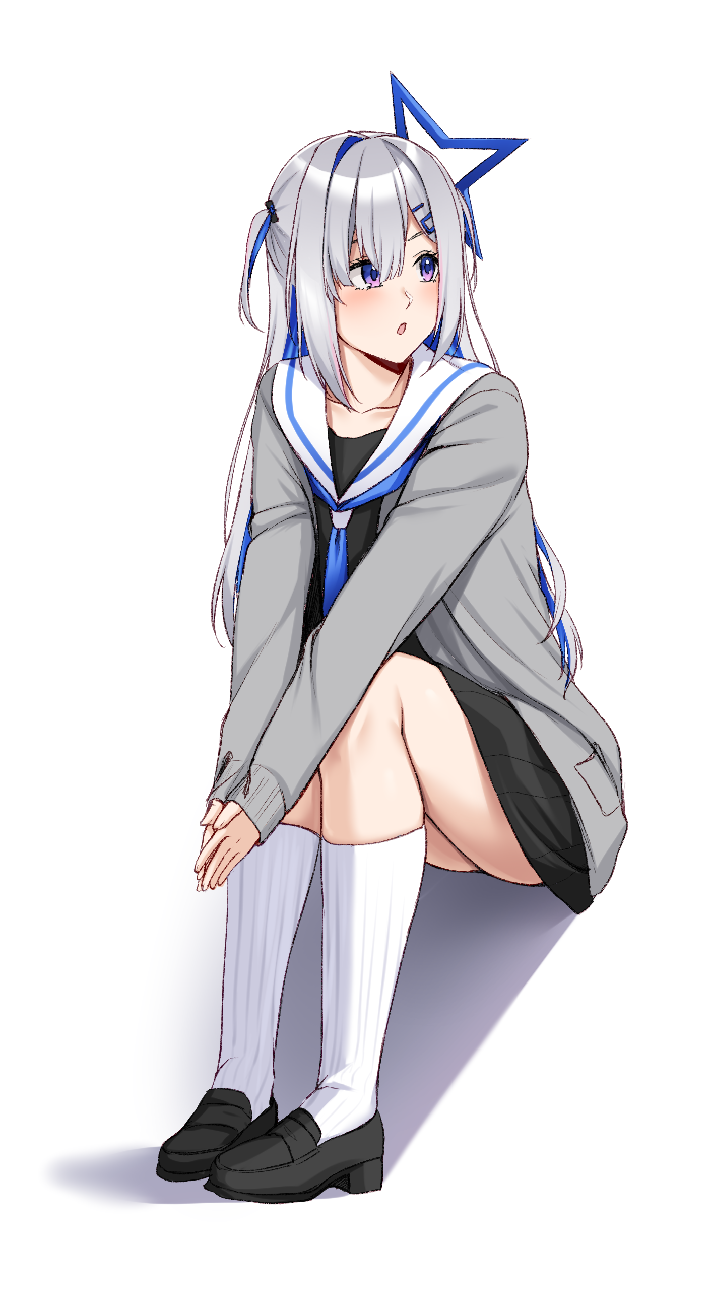 1girl absurdres alternate_costume amane_konata black_serafuku black_shirt black_shoes black_skirt blue_neckerchief breasts cardigan collarbone grey_cardigan grey_hair highres hololive knees_up loafers long_sleeves neckerchief open_cardigan open_clothes open_mouth own_hands_together palms_together purple_eyes sailor_collar school_uniform serafuku shirayuiii shirt shoes simple_background skirt socks solo thighs tongue virtual_youtuber white_background white_sailor_collar white_socks