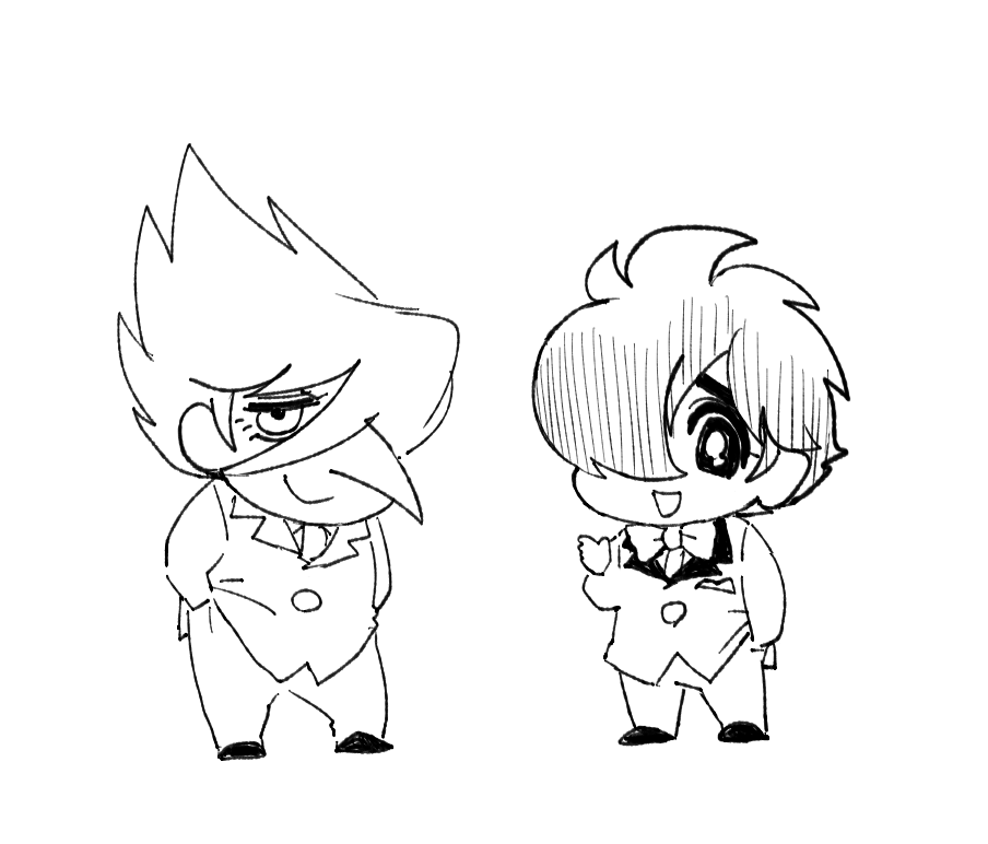 2boys ahoge black_shoes bow bowtie chibi cyborg cyborg_009 formal_clothes full_body hair_over_face hair_over_one_eye hands_in_pockets jet_link long_hair looking_at_viewer multiple_boys necktie shimamura_joe shoes short_hair spiked_hair suit white_bow white_bowtie white_necktie white_suit y02skman