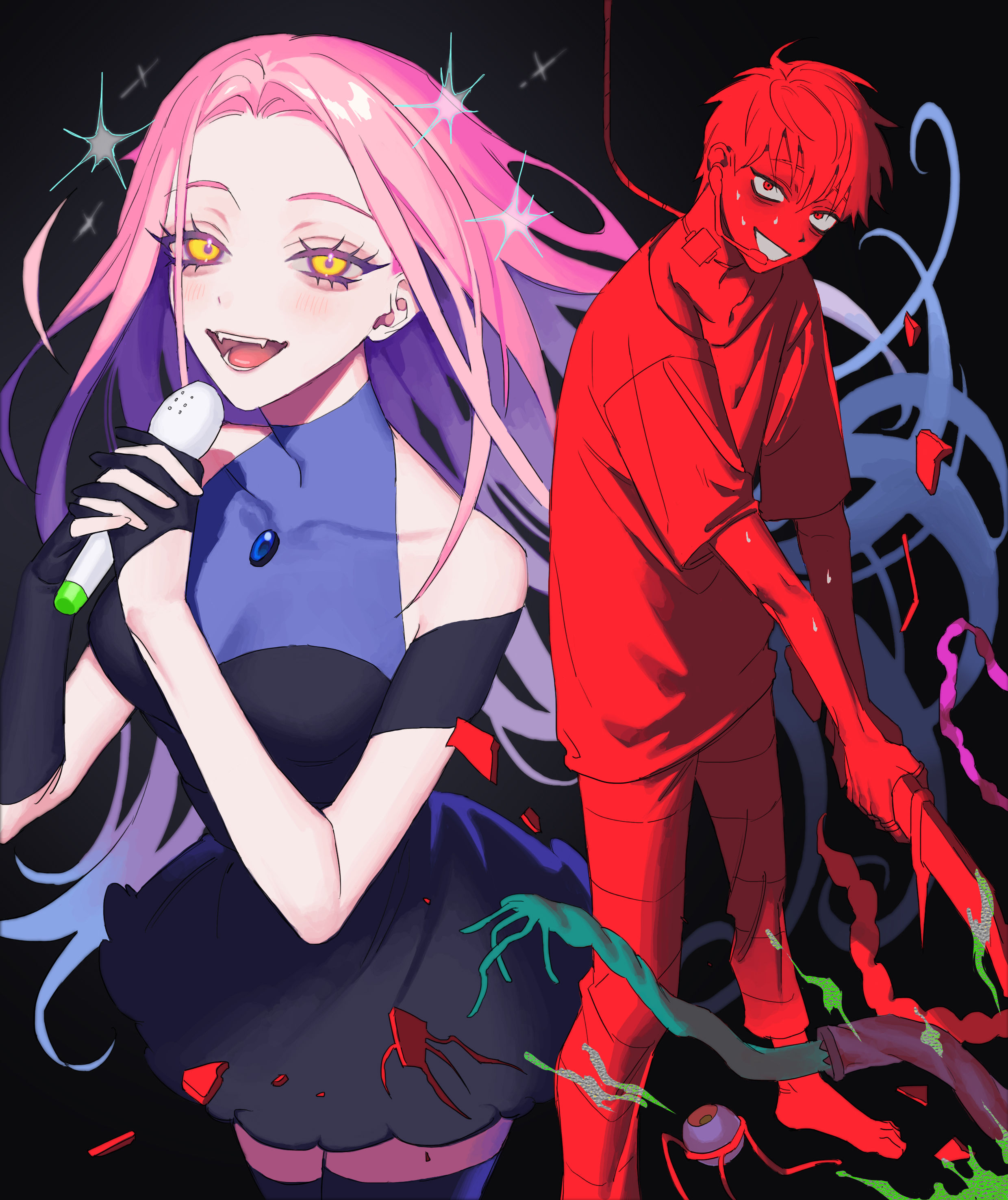 1boy 1girl absurdres alien_stage asakare asymmetrical_gloves barefoot black_dress black_gloves black_thighhighs blue_hair cable commentary dress elbow_gloves eyeball gloves gradient_hair grin half_gloves hashtag-only_commentary highres holding holding_microphone interlocked_fingers long_hair microphone mizi_(alien_stage) multicolored_hair open_mouth pink_hair shirt single_elbow_glove single_half_glove smile thighhighs till_(alien_stage) two-tone_hair uneven_gloves very_long_hair yellow_eyes