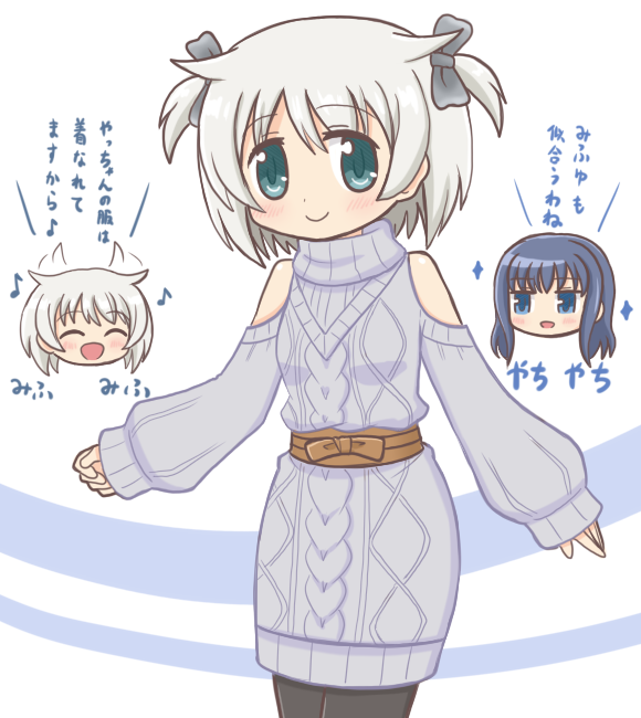 2girls alternate_hairstyle azusa_mifuyu bad_id bad_pixiv_id black_pantyhose blue_eyes bow breasts chibi chibi_inset closed_mouth clothing_cutout commentary_request cosplay cowboy_shot dress grey_bow grey_hair hair_bow hair_horns hair_wagging long_sleeves looking_at_viewer magia_record:_mahou_shoujo_madoka_magica_gaiden mahou_shoujo_madoka_magica multiple_girls musical_note nanami_yachiyo nanami_yachiyo_(cosplay) nanami_yachiyo_(winter_costume) official_alternate_costume pantyhose reverse_(bluefencer) short_hair shoulder_cutout sleeves_past_wrists smile solo_focus sparkle standing sweater sweater_dress translation_request two_side_up