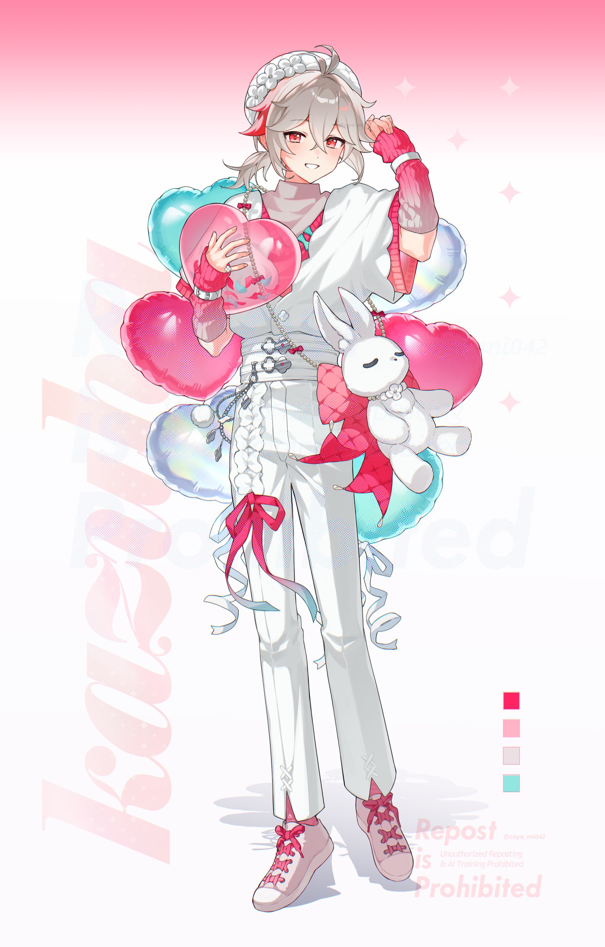 1boy :d absurdres alternate_costume antenna_hair arm_warmers balloon commentary crossed_bangs dot_nose double-parted_bangs full_body genshin_impact gradient_arm_warmers grey_hair grin hair_bun hands_up heart_balloon highres holding holding_balloon kaedehara_kazuha light_blush long_bangs looking_at_viewer medium_hair mochimiya_(coyo) open_mouth pants pink_arm_warmers pink_ribbon pink_shoes red_eyes ribbon shirt shoes short_sleeves smile solo stuffed_animal stuffed_rabbit stuffed_toy white_background white_pants white_shirt