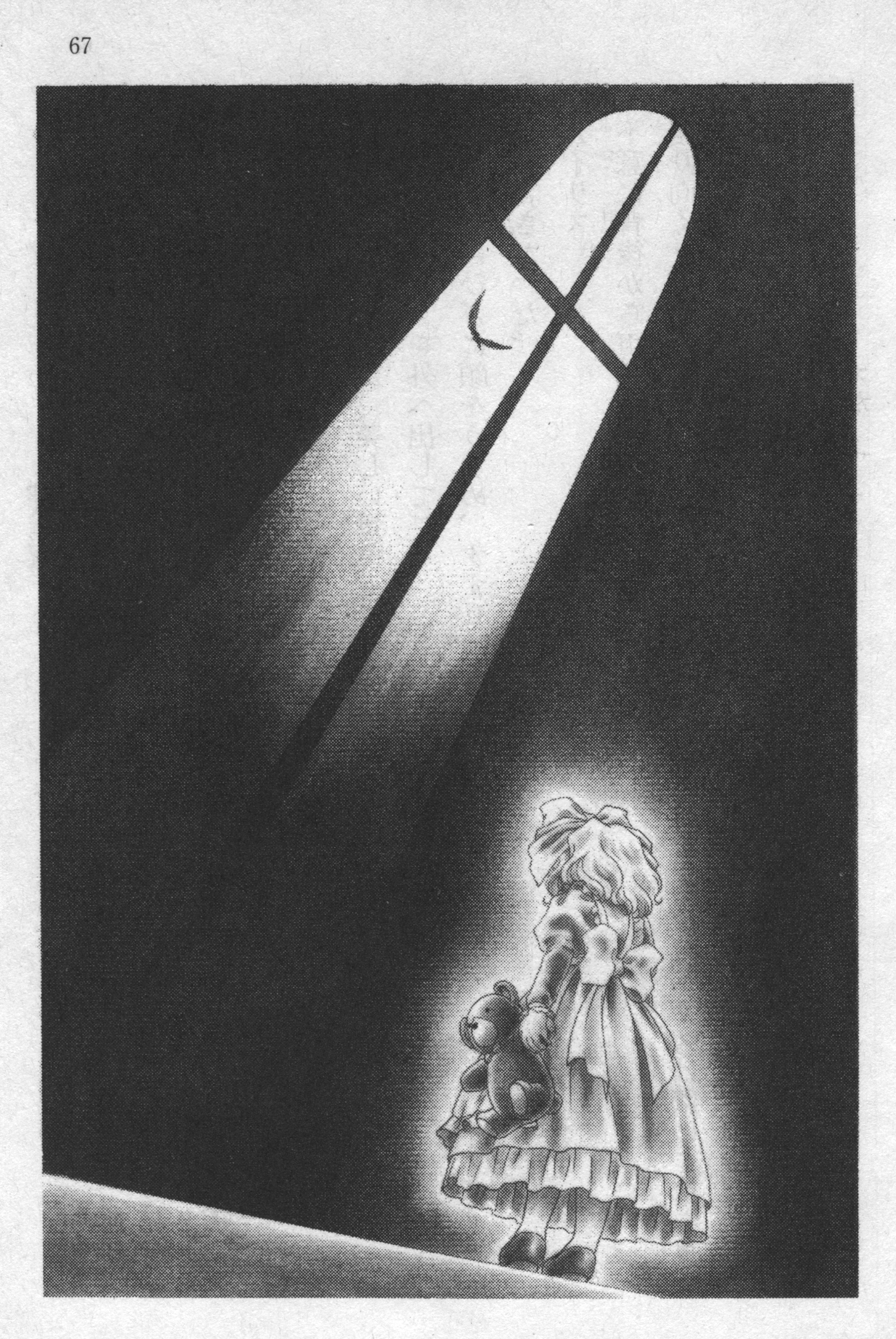 1girl absurdres apron archived_source back_bow bird black_shoes border bow child dress dutch_angle floor frilled_apron frills highres holding holding_stuffed_toy holding_stuffed_toy iris_chateaubriand jean-paul juliet_sleeves legs_apart long_sleeves looking_down mary_janes medium_hair negative_space official_art okuda_matsuri page_number pantyhose petticoat puffy_sleeves sad sakura_taisen scan sega shoes solo standing stuffed_animal stuffed_toy teddy_bear third-party_source traditional_media wavy_hair white_border white_pantyhose window
